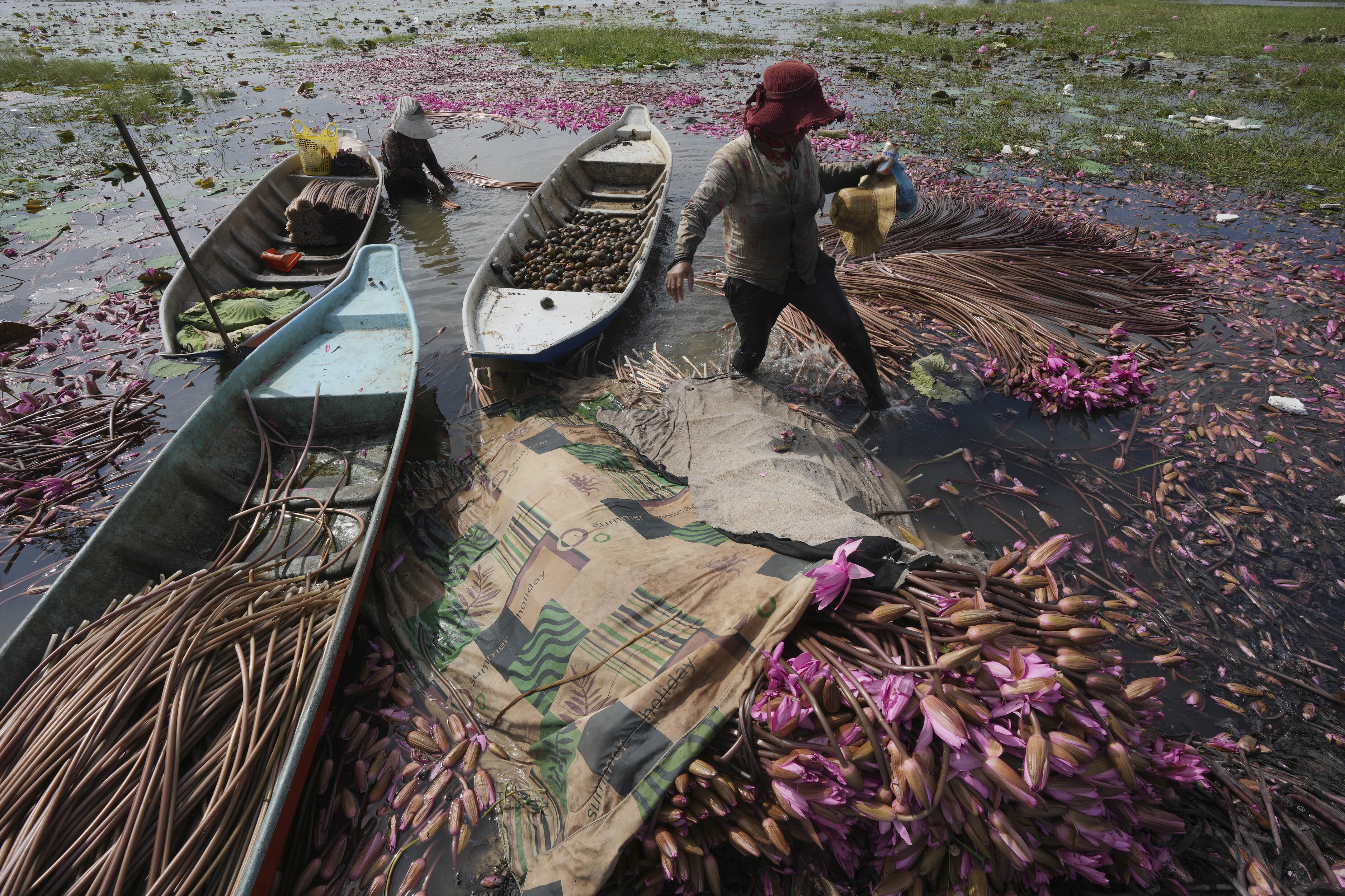 Cambodian farmers collect water lilies from Angkep lake to sell at a market, in Kampong Speu province, southwest of Phnom Penh, Cambodia, Thursday, December 7, 2023. Locals purchase the lilies as an ingredient for soup. (Photo by Heng Sinith/AP Photo)