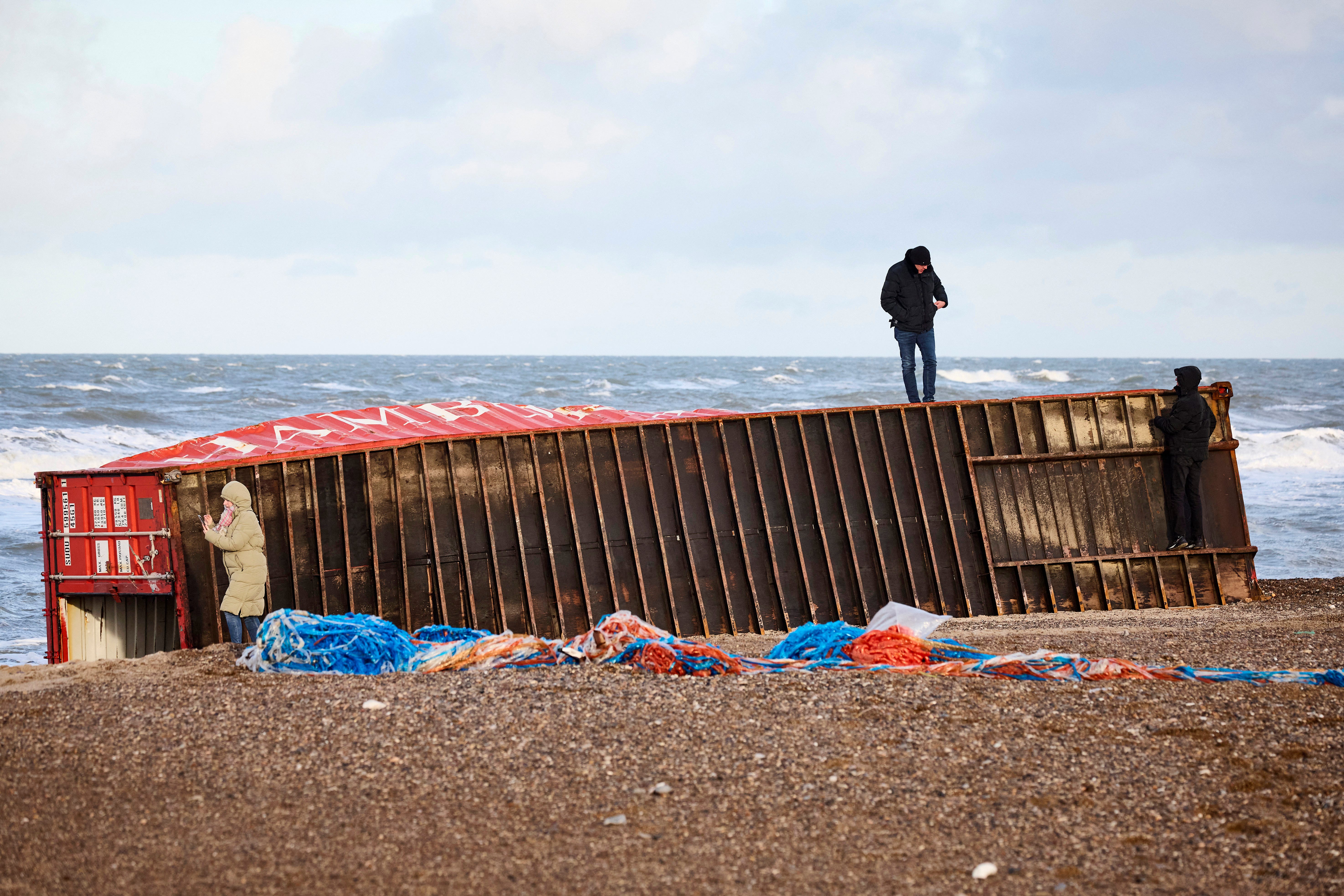 Visitors inspect a cargo container that was washed ashore on the Danish west coast at Tranum beach in North Jutland, Denmark on December 26, 2023. The contents of 46 containers were lost overboard from the ship Mayview Maersk during storm Pia and were washed ashore along the northern part of Denmark's North Sea shoreline. (Photo by Claus Bjoern Larsen/Ritzau Scanpix via AFP Photo)