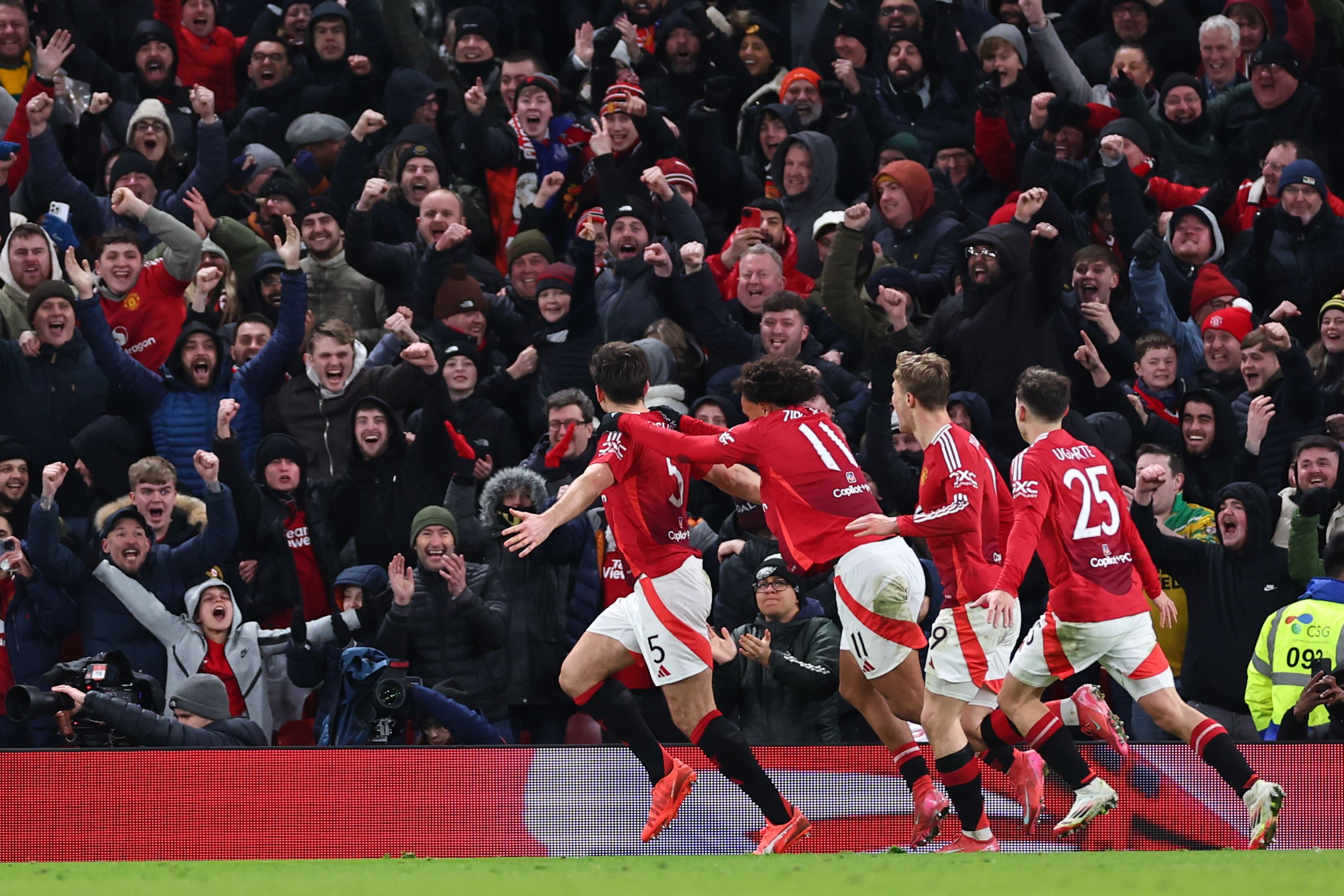 Harry Maguire of Manchester United celebrates after scoring a goal to make it 2-1 during the Emirates FA Cup Fourth Round match between Manchester United and Leicester City at Old Trafford on February 7, 2025 in Manchester, England. (Photo by Robbie Jay Barratt - AMA/Getty Images)