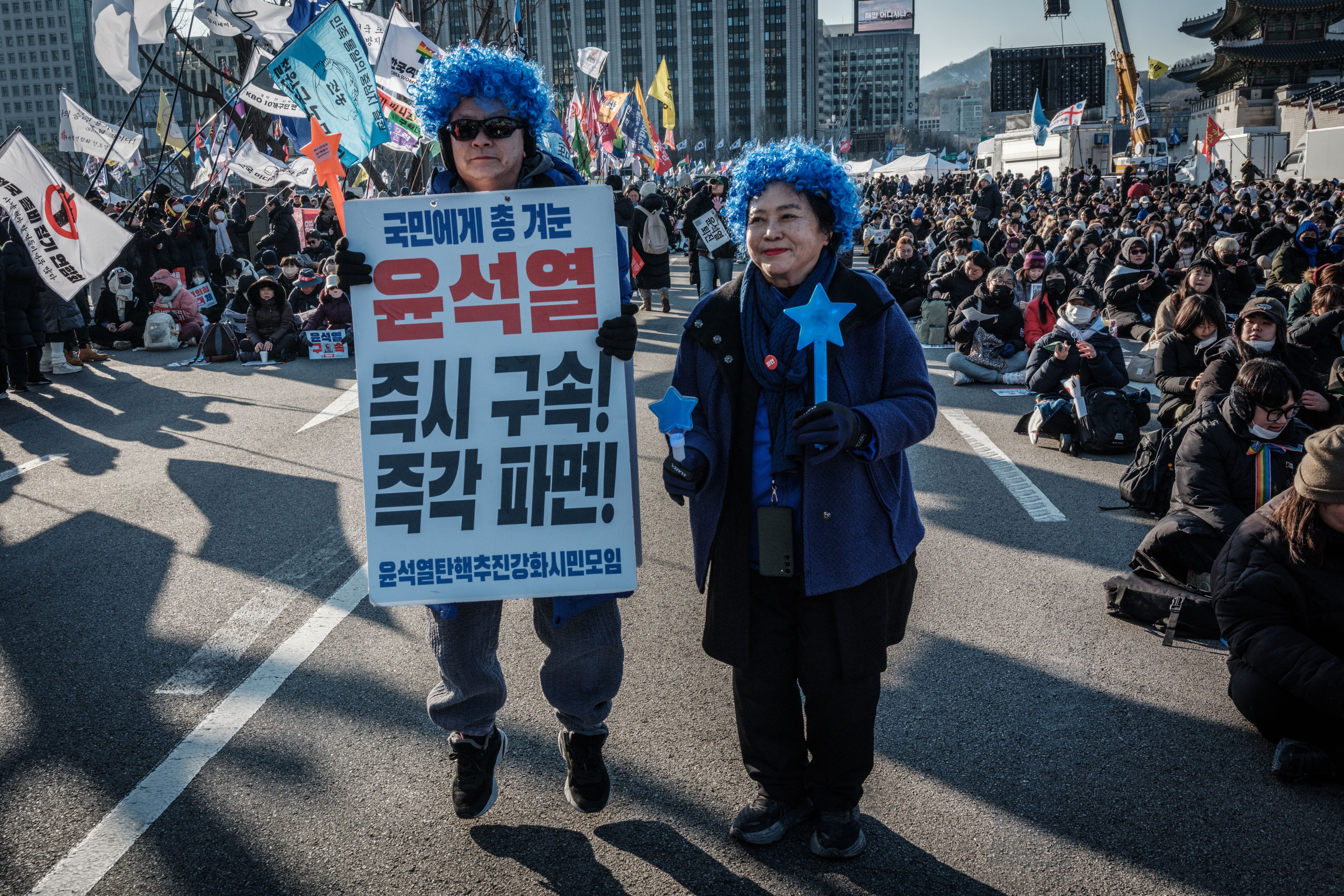 Protesters pose as they wait for a demonstration against impeached South Korean President Yoon Suk Yeol near the Gwanghwamun Gate in Seoul on January 11, 2025. Thousands of South Koreans gathered for rival demonstrations in the capital on January 11, as investigators prepare another attempt to arrest suspended President Yoon Suk Yeol over his short-lived martial law decree. (Photo by Yasuyoshi Chiba/AFP Photo)