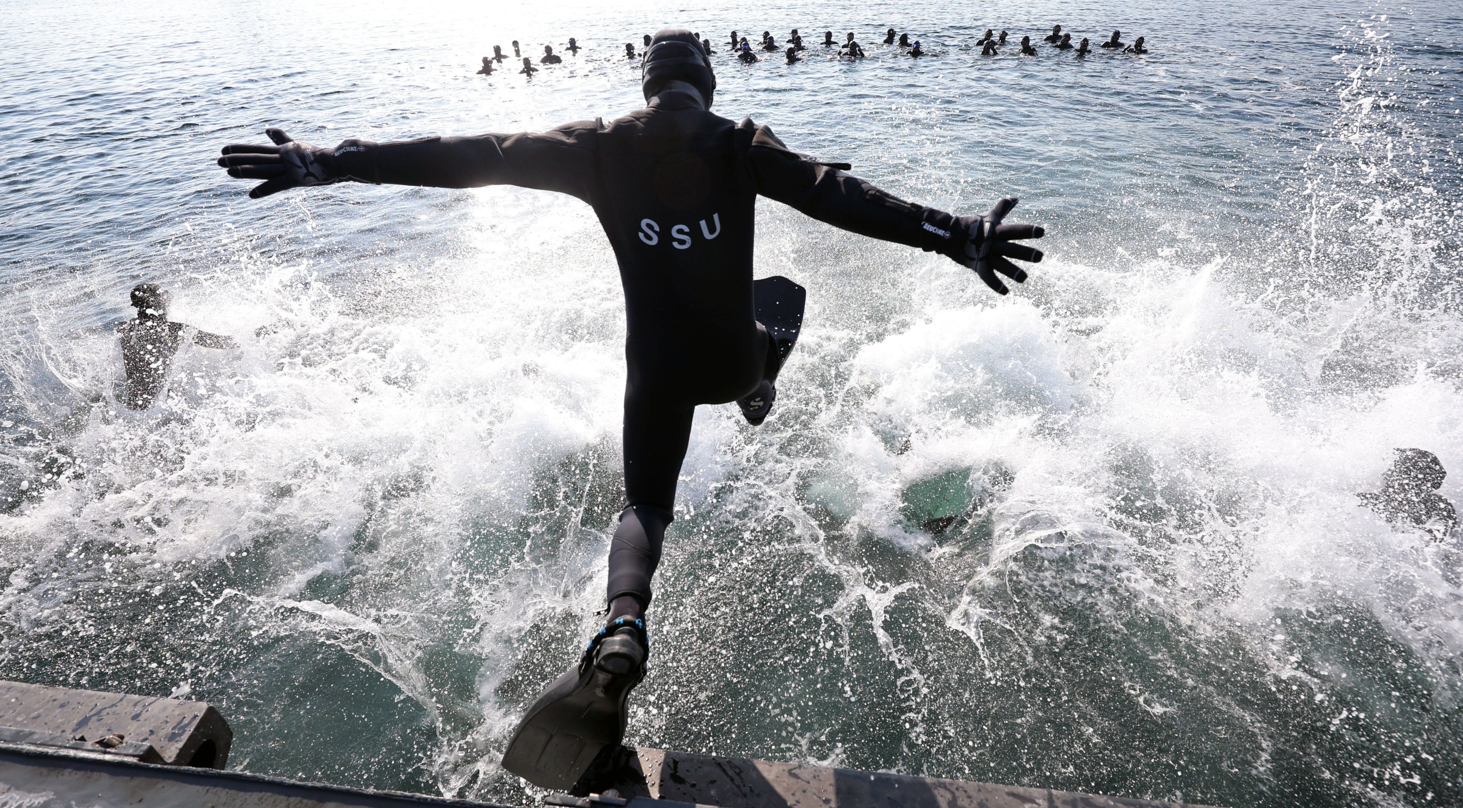 Members of South Korean Navy's elite Sea Salvage and Rescue Unit jump into the sea at a naval port in Changwon, South Korea, 17 January 2025, as part of their cold weather exercise. (Photo by Yonhap/EPA/EFE)