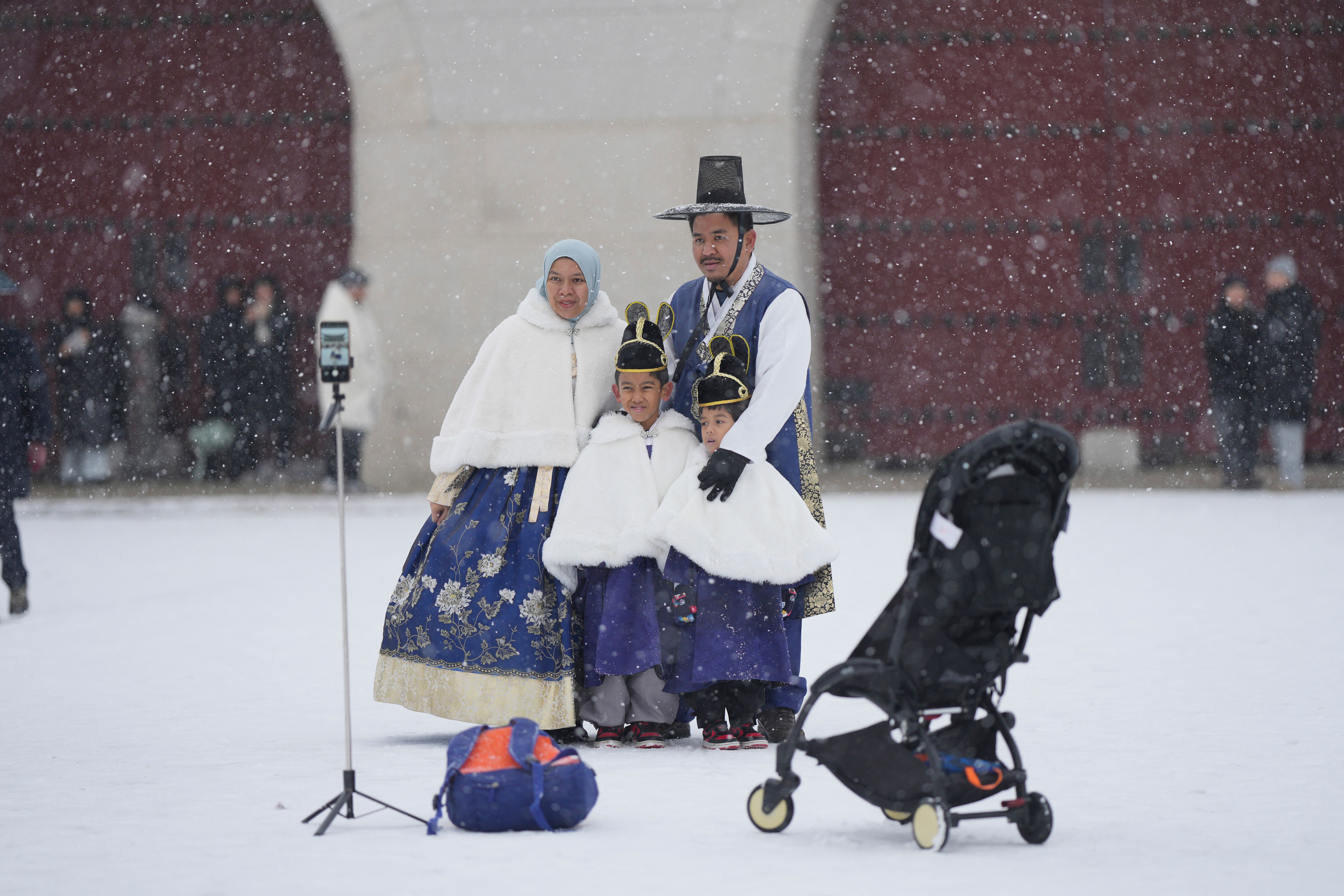 A group of family members from Malaysia pose for a selfie in the snow in front of the Gwanghwamun, the main gate of the 14th-century Gyeongbok Palace, one of South Korea's well known landmarks, in Seoul, South Korea, Friday, January 31, 2025. (Photo by Lee Jin-man/AP Photo)