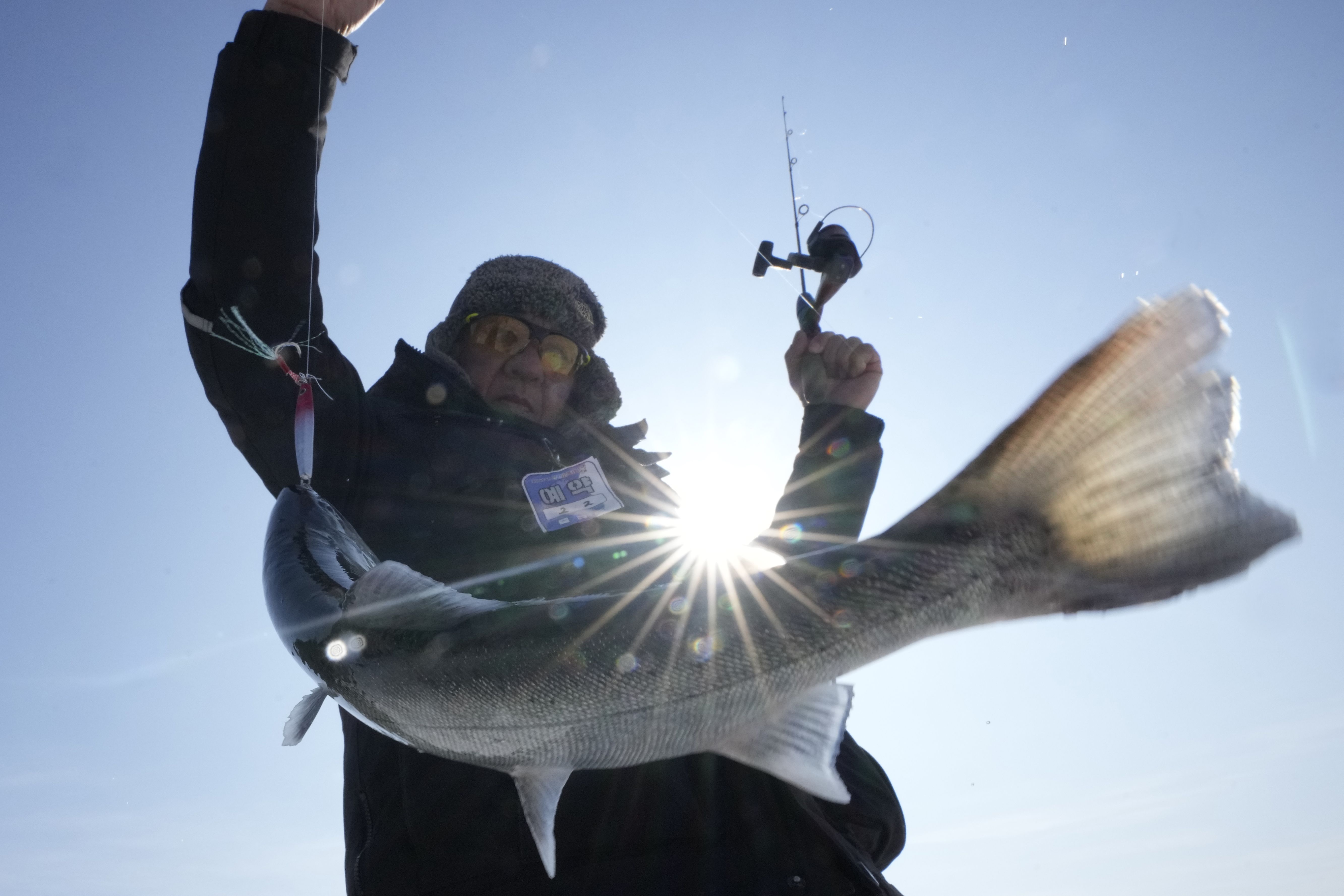 A participant catches a trout on a frozen river during a trout catching contest in Hwacheon, South Korea, Sunday, February 2, 2025. (Photo by Ahn Young-joon/AP Photo)