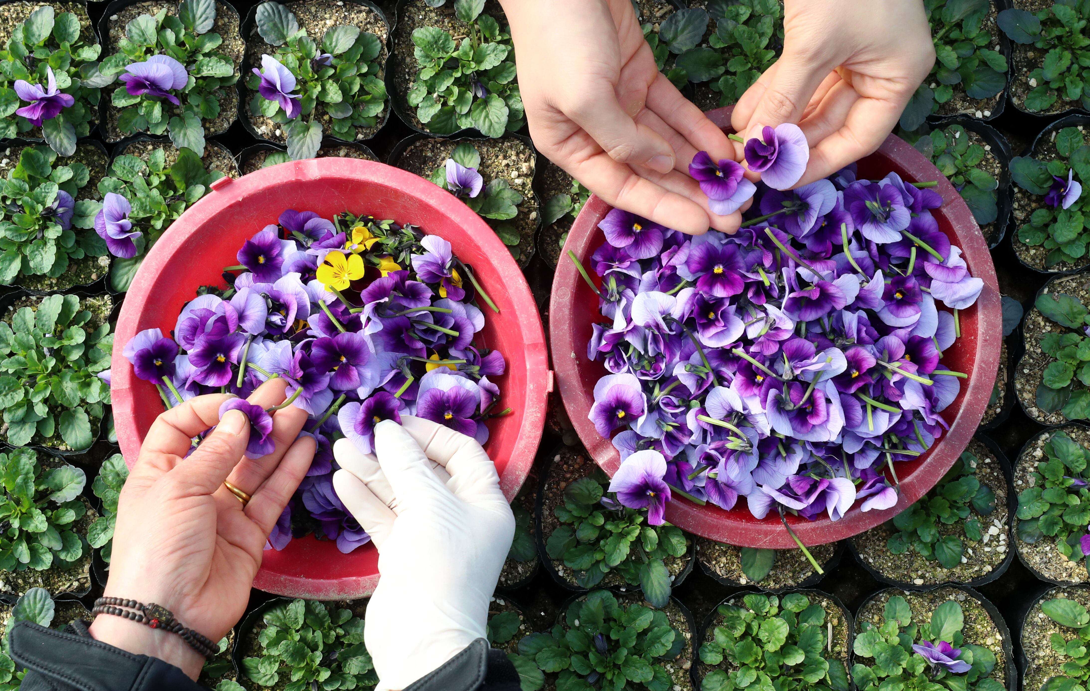 On the morning of the February 3, 2025, the beginning of spring according to the solar calendar, an employee is picking pansy flower buds at the nursery of the Hanbat Arboretum Landscape Tree Production Complex in Yuseong-gu, Daejeon. The cultivated pansies are distributed throughout Daejeon and used to decorate the city center. (Photo by Shin Hyeon-jong)