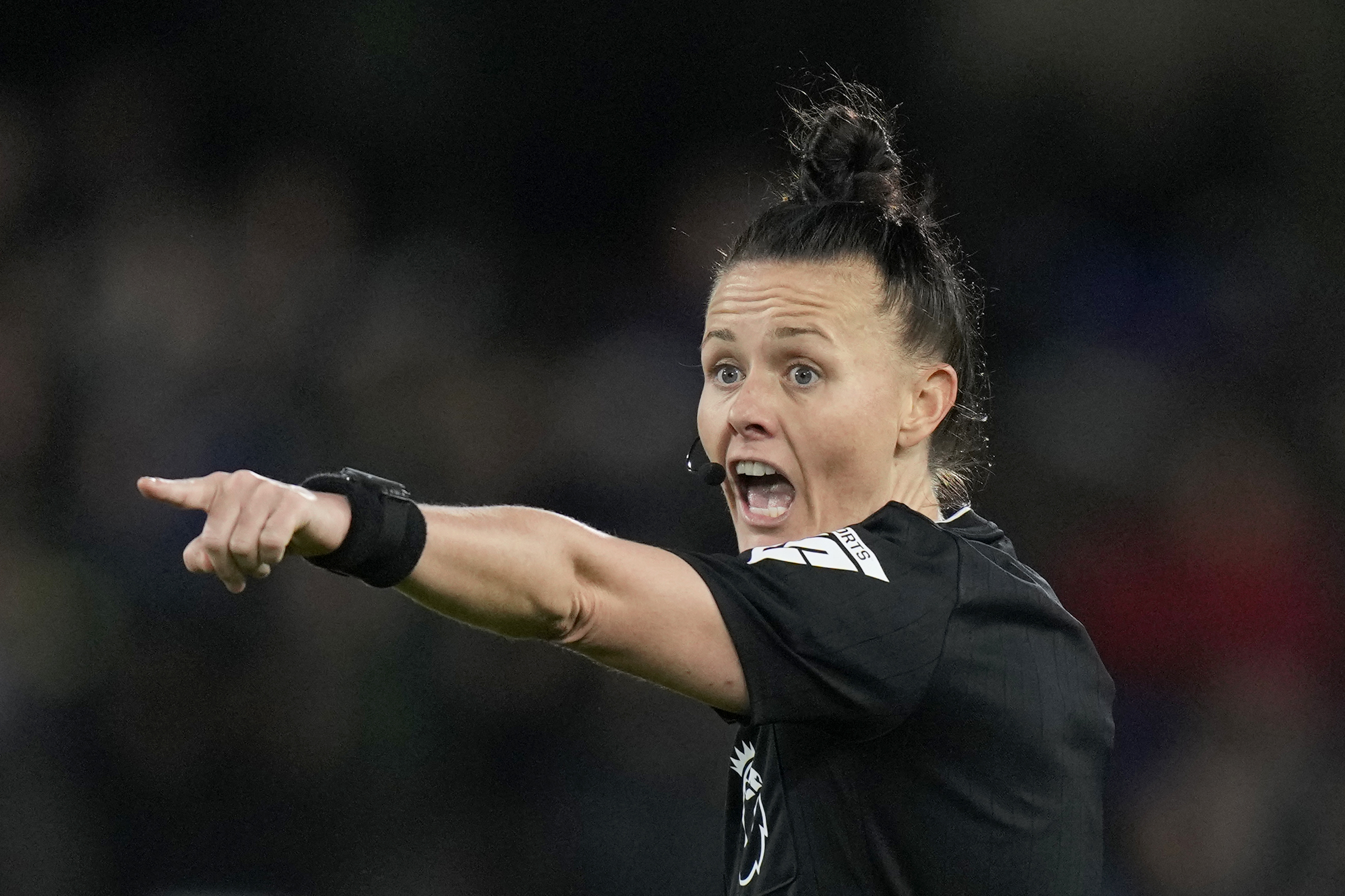 Referee Rebecca Welch gestures during the English Premier League soccer match between Fulham and Burnley at Craven Cottage stadium in London, Saturday, December 23, 2023. Welch is the first female referee ever to officiate an English Premier League game. (Photo by Alastair Grant/AP Photo)
