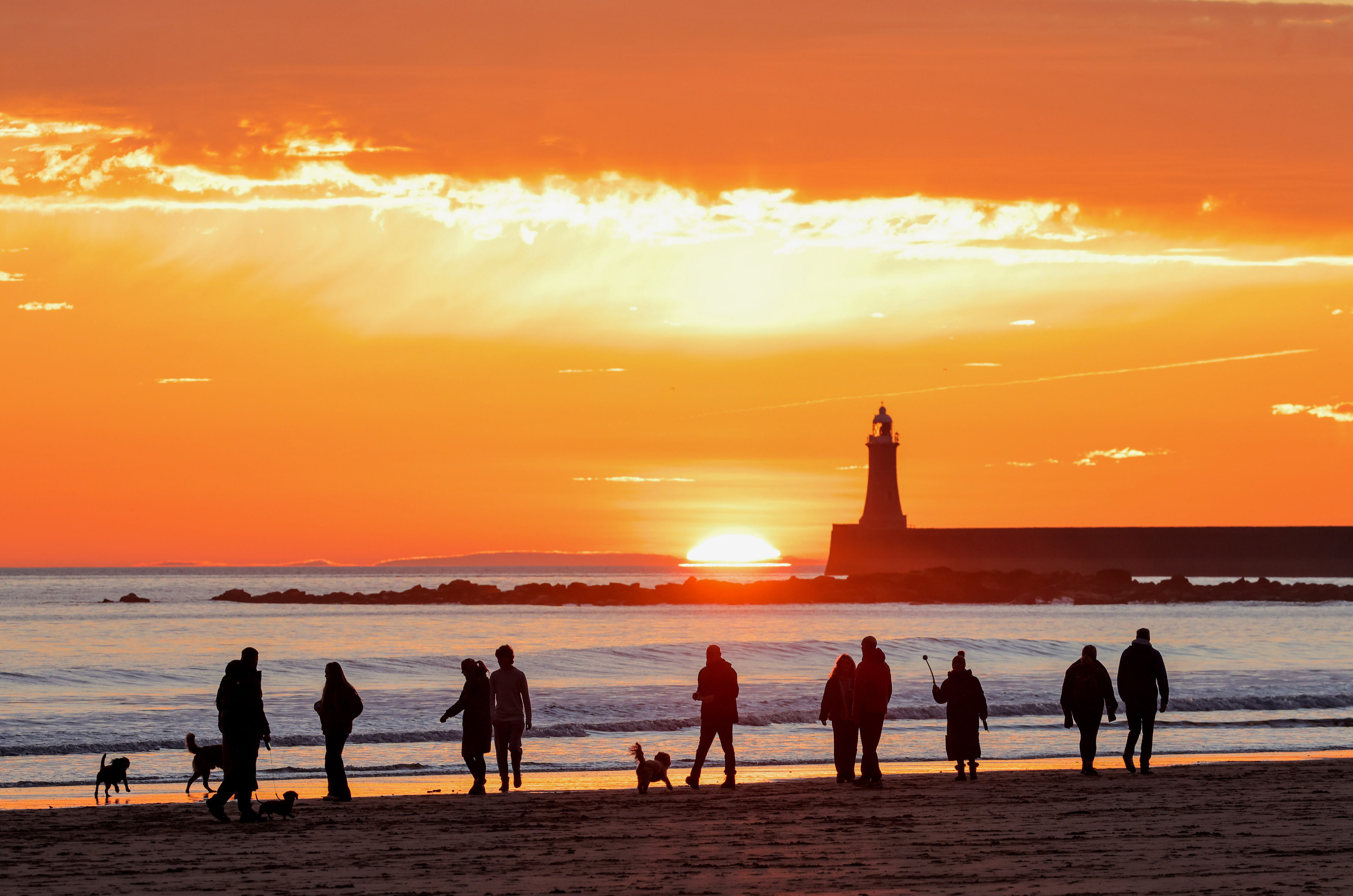 Dog walkers take in the sunrise at Tynemouth Longsands beach in North Tyneside, UK on December 25, 2024. (Photo by Will Walker/North News and Pictures)