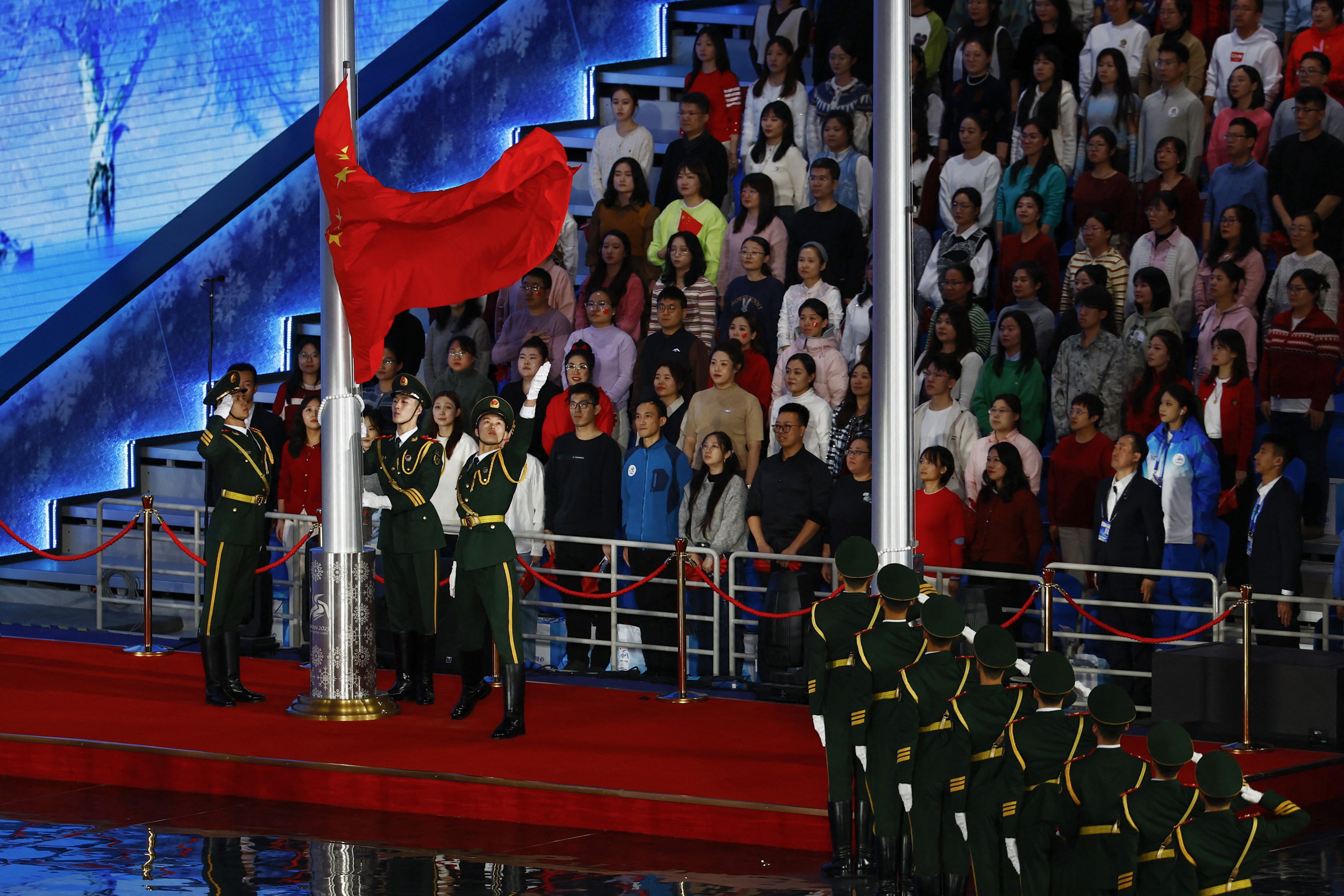 Members of the Chinese military raise a flag of China during the opening ceremony of the 9th Asian Winter Games in Harbin, China, Friday, February 7, 2025. (Photo by Issei Kato/Pool Photo via AP Photo)