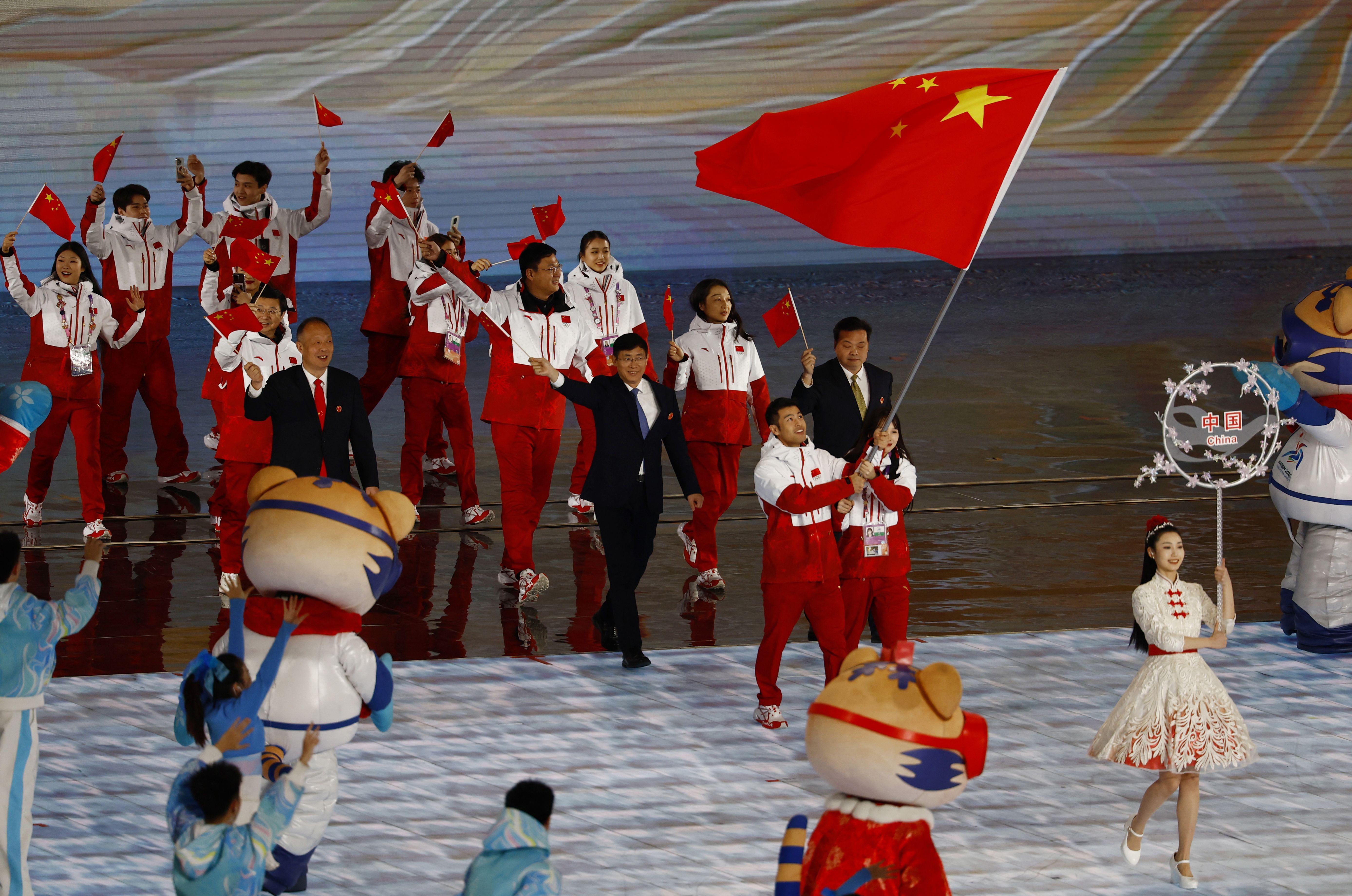 Flag bearers Ning Zhongyan and Liu Mengting of China lead their contingent during the parade of athletes at the opening ceremony of the 9th Asian Winter Games in Harbin, China, Friday, February 7, 2025. (Photo by Issei Kato/Pool Photo via AP Photo)