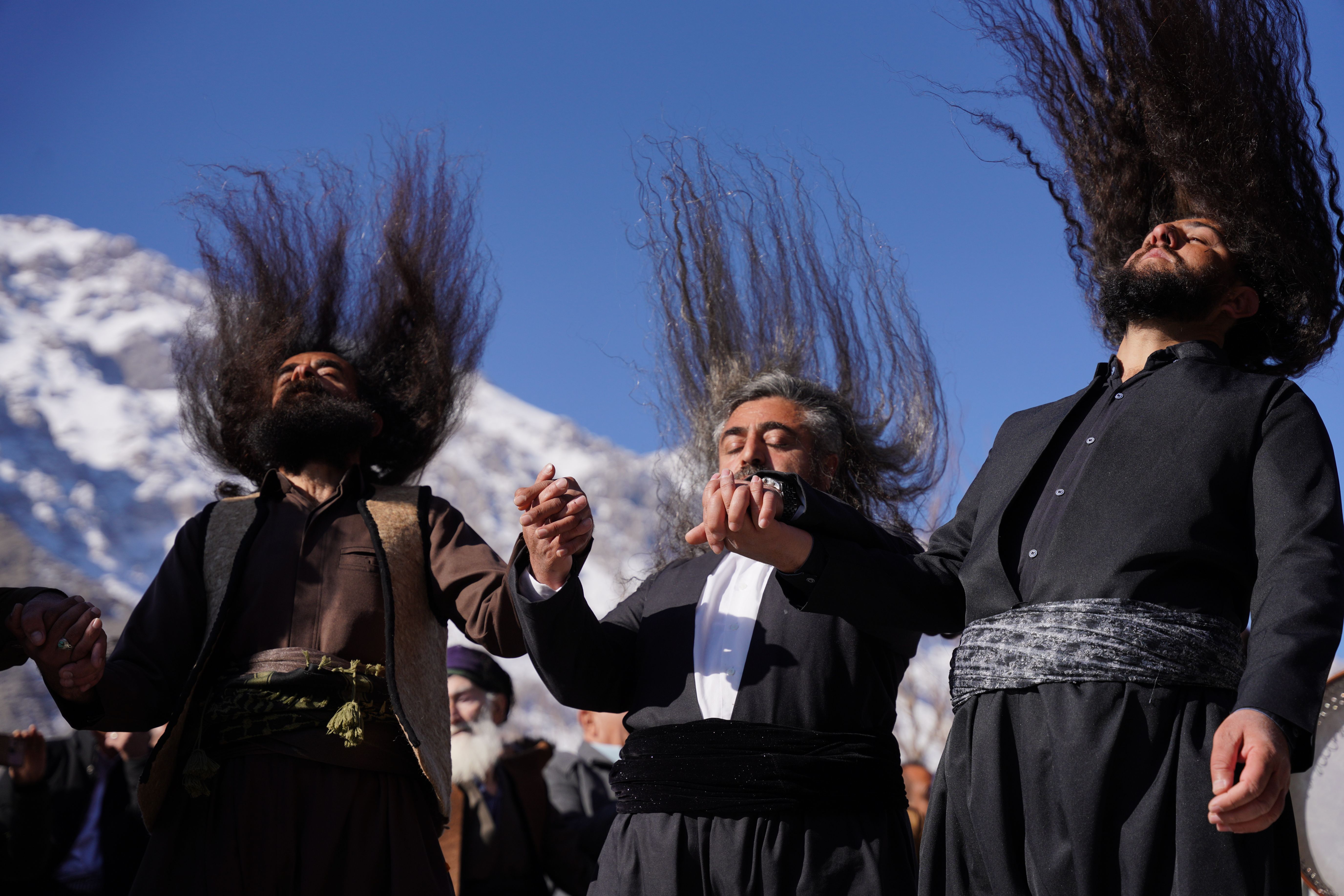 Men, wearing traditional clothes, are seen as “Pir Shaliar” event, which is celebrated twice a year, continues in the Hawraman, Iran on January 30, 2025. At the event, def teams consisting of men and women formed dhikr rings by playing the def on the slopes of the mountain accompanied by hymns. (Photo by Fariq Faraj Mahmood/Anadolu via Getty Images)