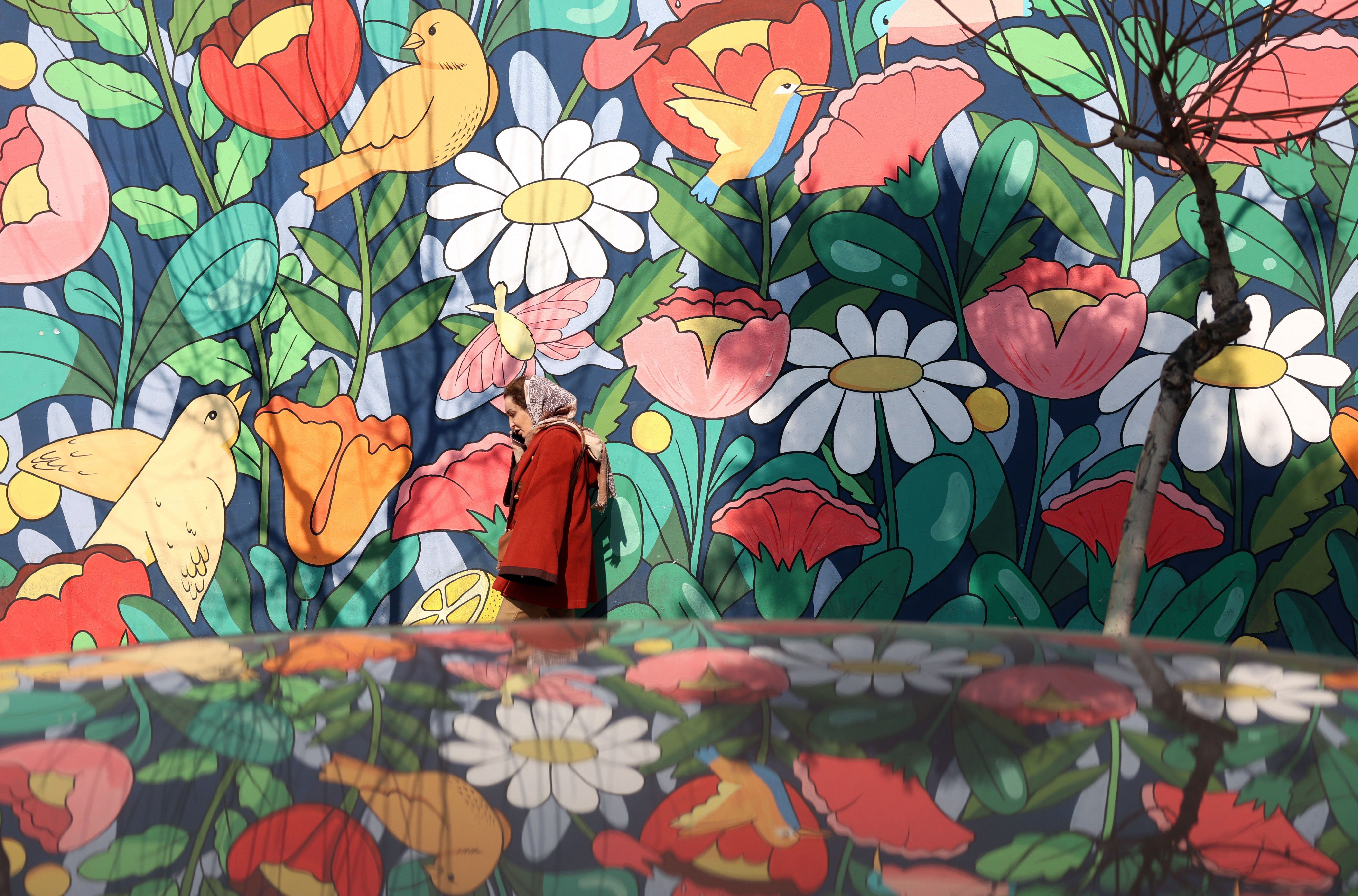 An Iranian woman walks next to a wall painting in a street in Tehran, Iran, 03 February 2025. Iran will celebrate its 46th revolution anniversary on 10 February 2025. (Photo by Abedin Taherkenareh/EPA)