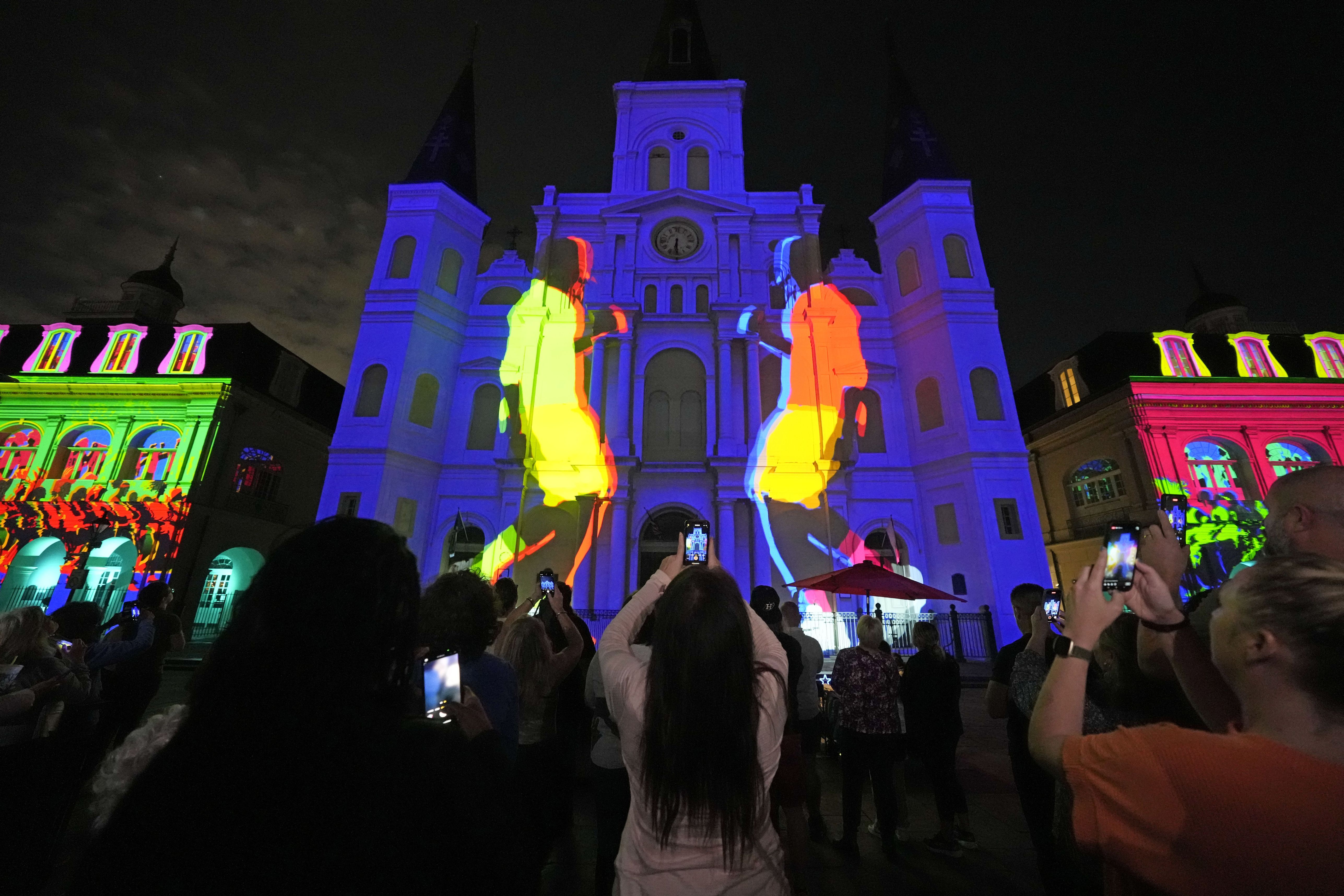 People watch a laser light show projected onto St. Louis Cathedral in the French Quarter, Tuesday, February 4, 2025, as part of the week's festivities leading up to Super Bowl 59 in New Orleans. (Photo by Gerald Herbert/AP Photo)