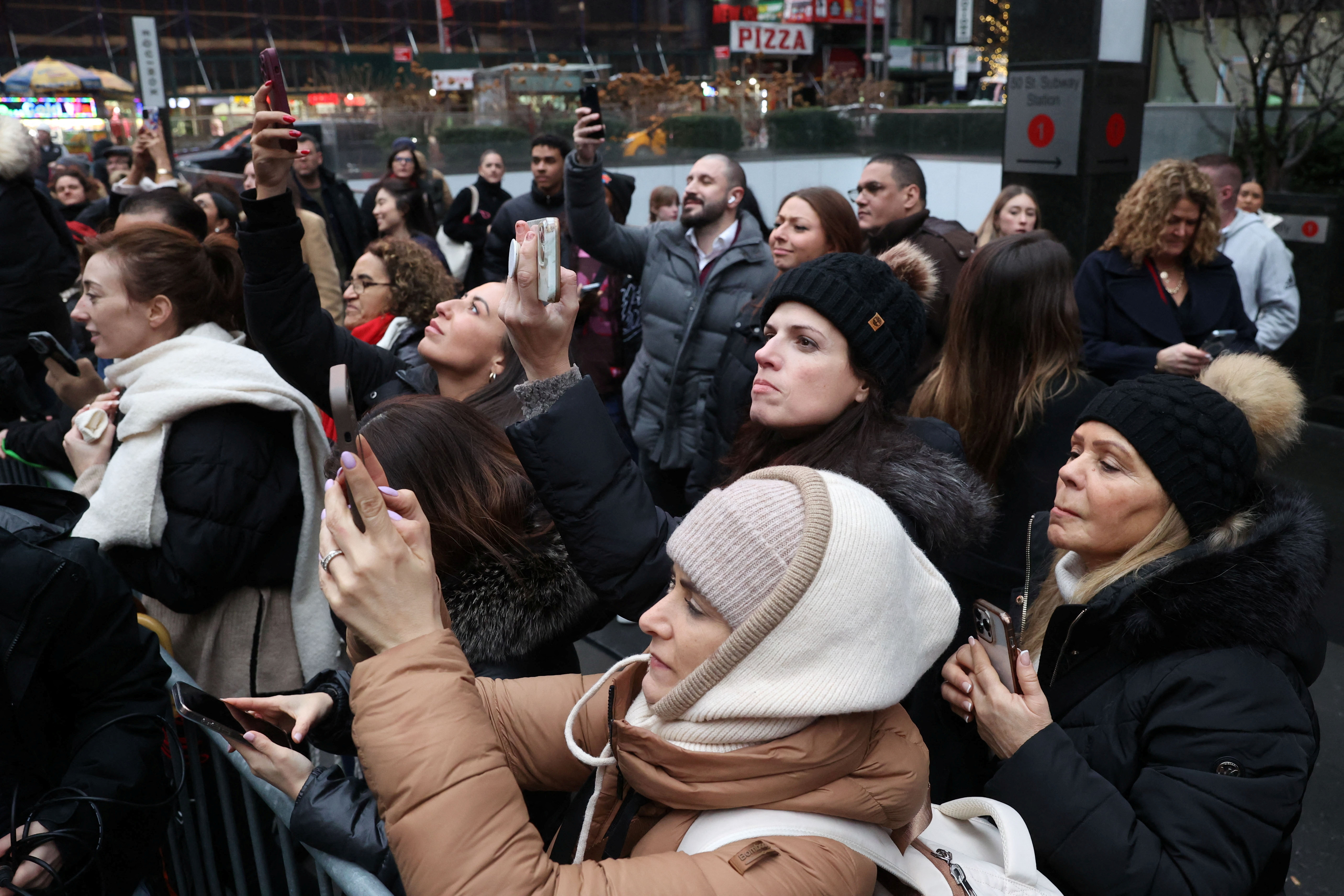 People try to get a photograph as George Clooney poses with cast members of “Goodnight and Goodluck” outside the Winter Garden Theater, in New York City, U.S., February 6, 2025. (Photo by Caitlin Ochs/Reuters)