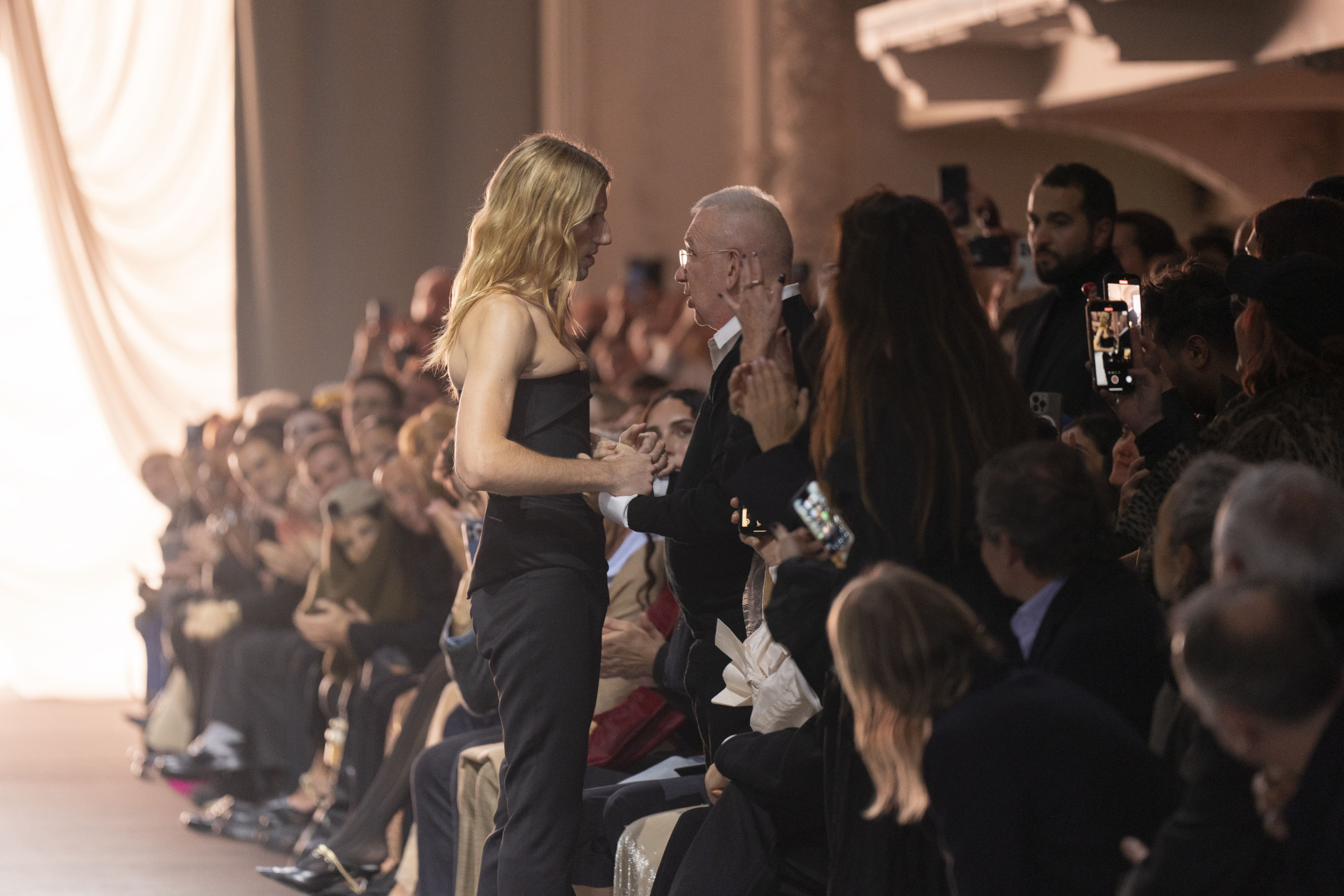 Designer Ludovic de Saint Sernin greets Jean Paul Gaultier at the end of the Jean Paul Gaultier Haute Couture Spring Summer 2025 collection, in Paris, Wednesday, January 29, 2025. (Photo by Lewis Joly/AP Photo)