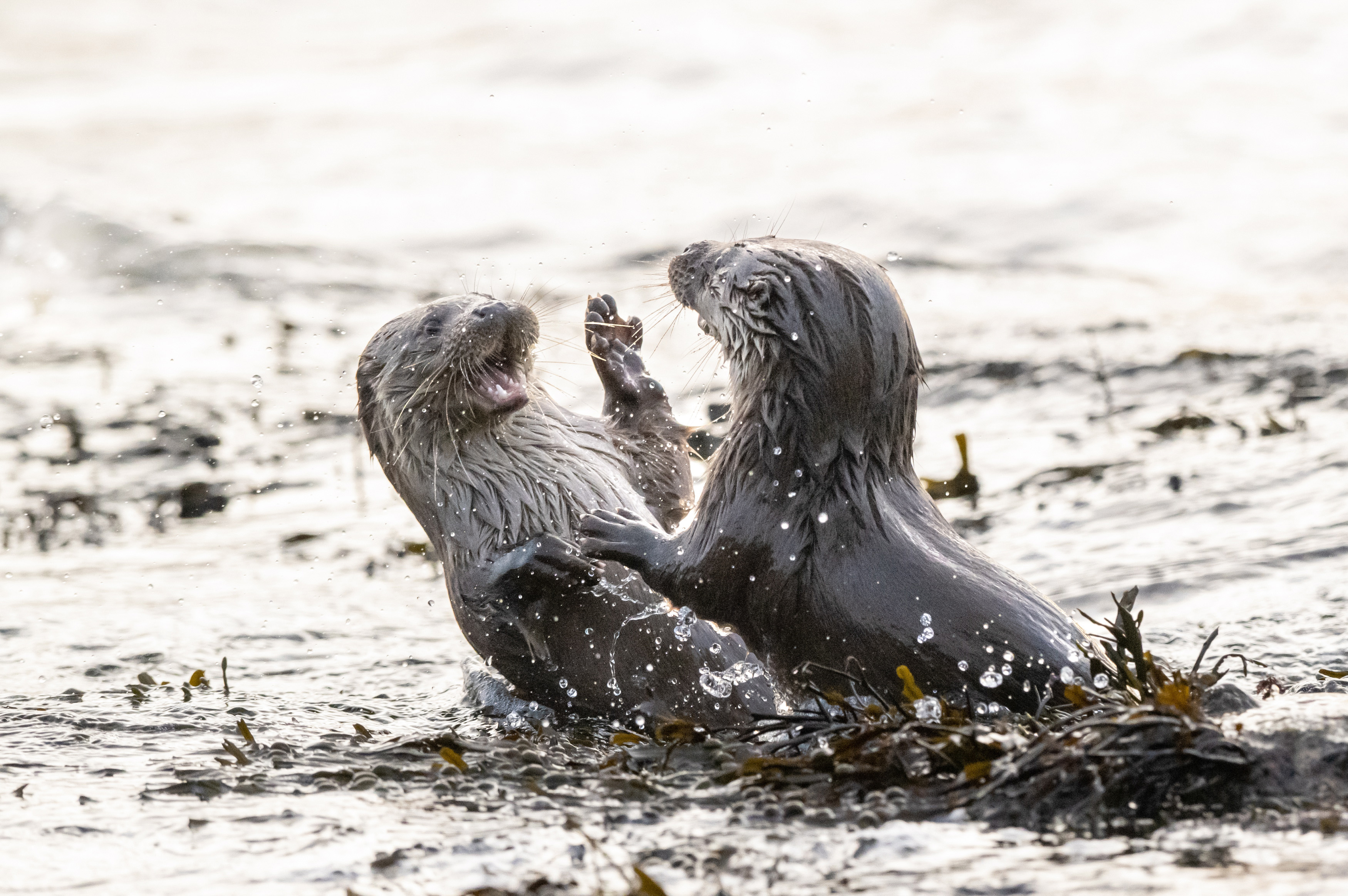 Otters engage in a sibling squabble, complete with “shouting” and slapping over their share of dinner on Shetland, Scotland early February 2025. (Photo by Brydon Thomason/Solent News)
