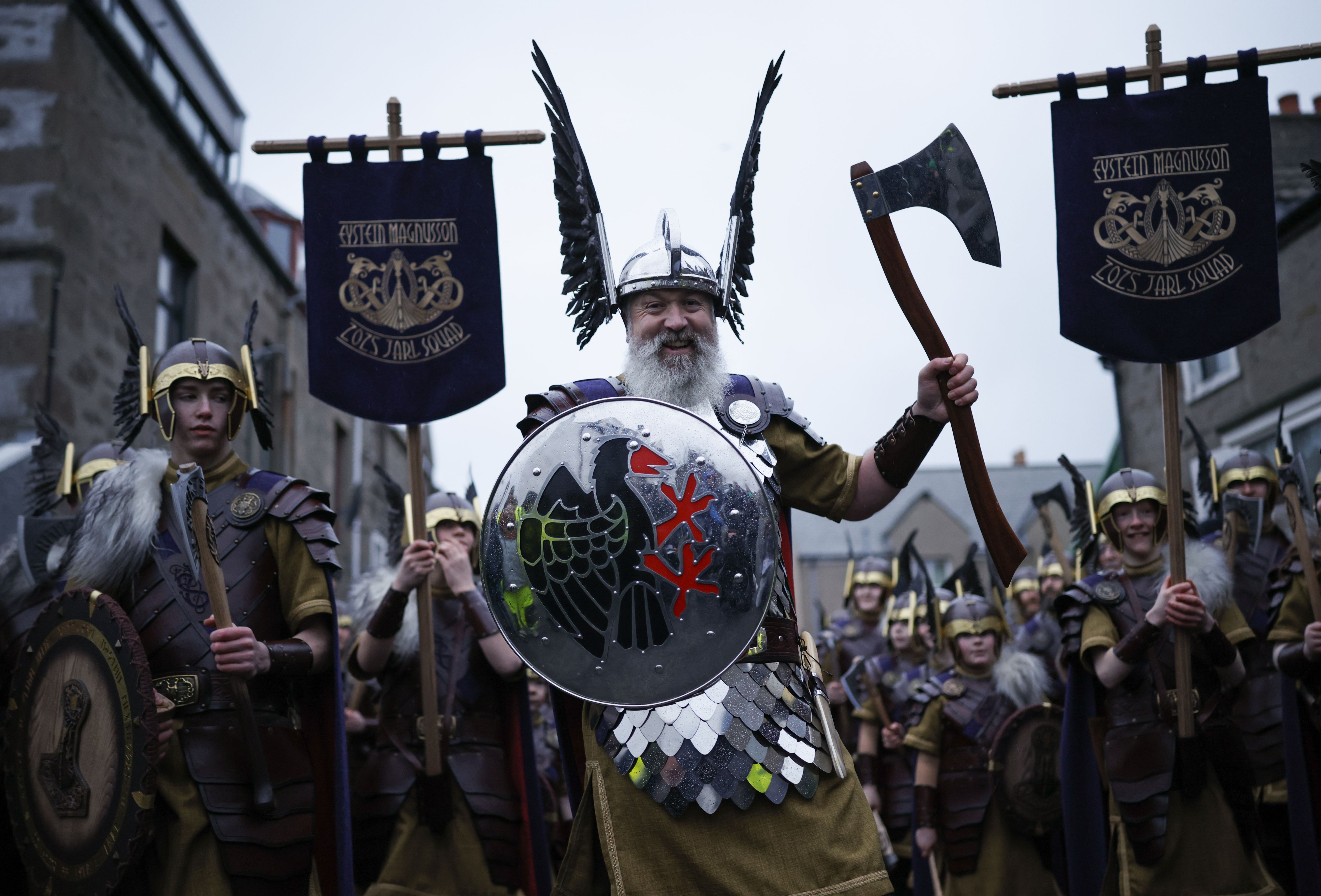 The leader of the march known as The Guizer Jarl leads members of the Up Helly Aa festival’s ‘Jarl Squad’ in the morning parade in Lerwick, Shetland Islands, Britain, 28 January 2025. Up Helly Aa festival dates back to the 1880s and celebrates Viking culture and heritage of the Shetland Islands. The event involves over one thousand torches used in processions by squads of costumed participants, known as guizers, who burn a Viking galley later in the night. (Photo by Tolga Akmen/EPA)