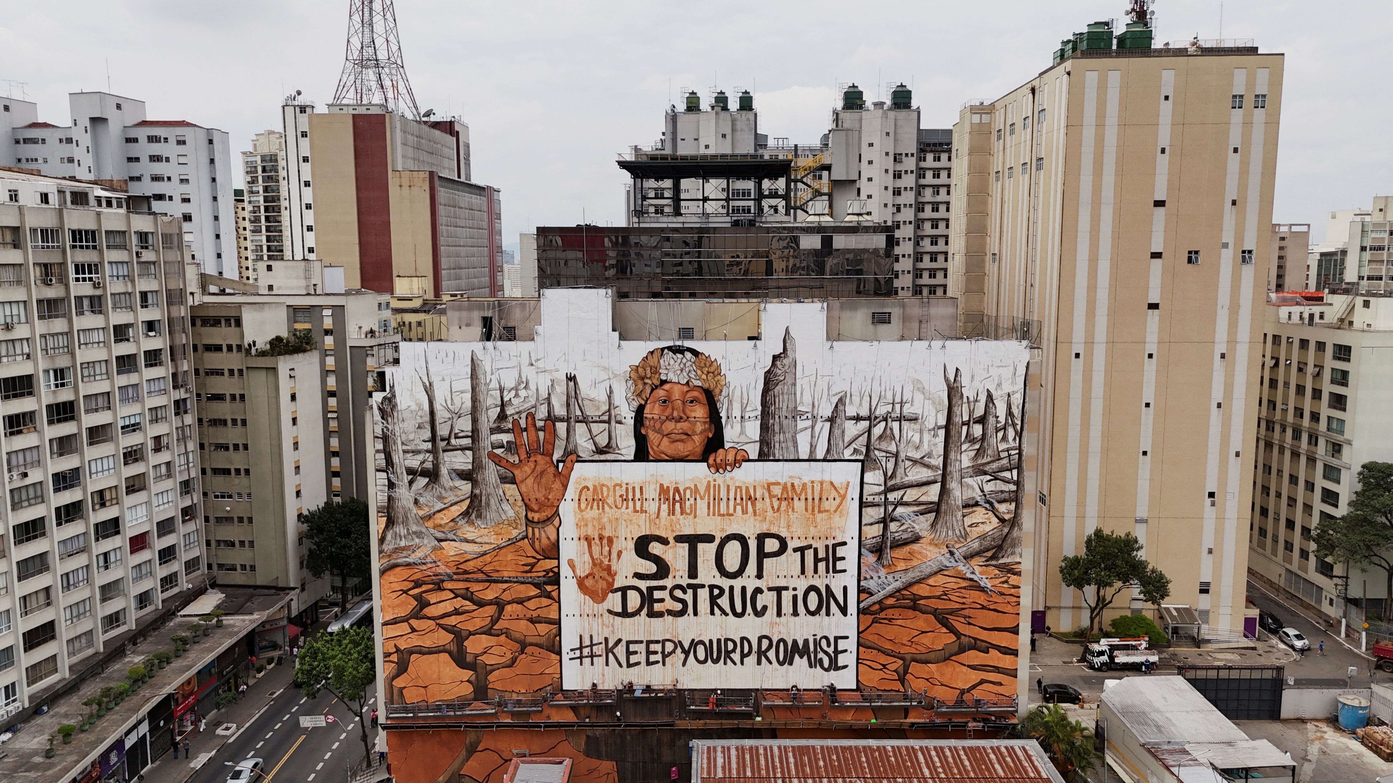 The mural “Stop the Destruction” depicting Alessandra Munduruku in protest against Cargill with the name Cargill-MacMillan family painted with mud which was erased later, is seen in Sao Paulo, Brazil on October 23, 2024. Mural is designed by Brazilian artist and activist Mundano, made with different shades and colors of paint and also ashes collected from fires in Amazon and other biomes, mud from floods in Rio Grande do Sul, white clay from Sawre Muybu indigenous land, clay from Jaragua indigenous land and Urucum. (Photo by Amanda Perobelli/Reuters)
