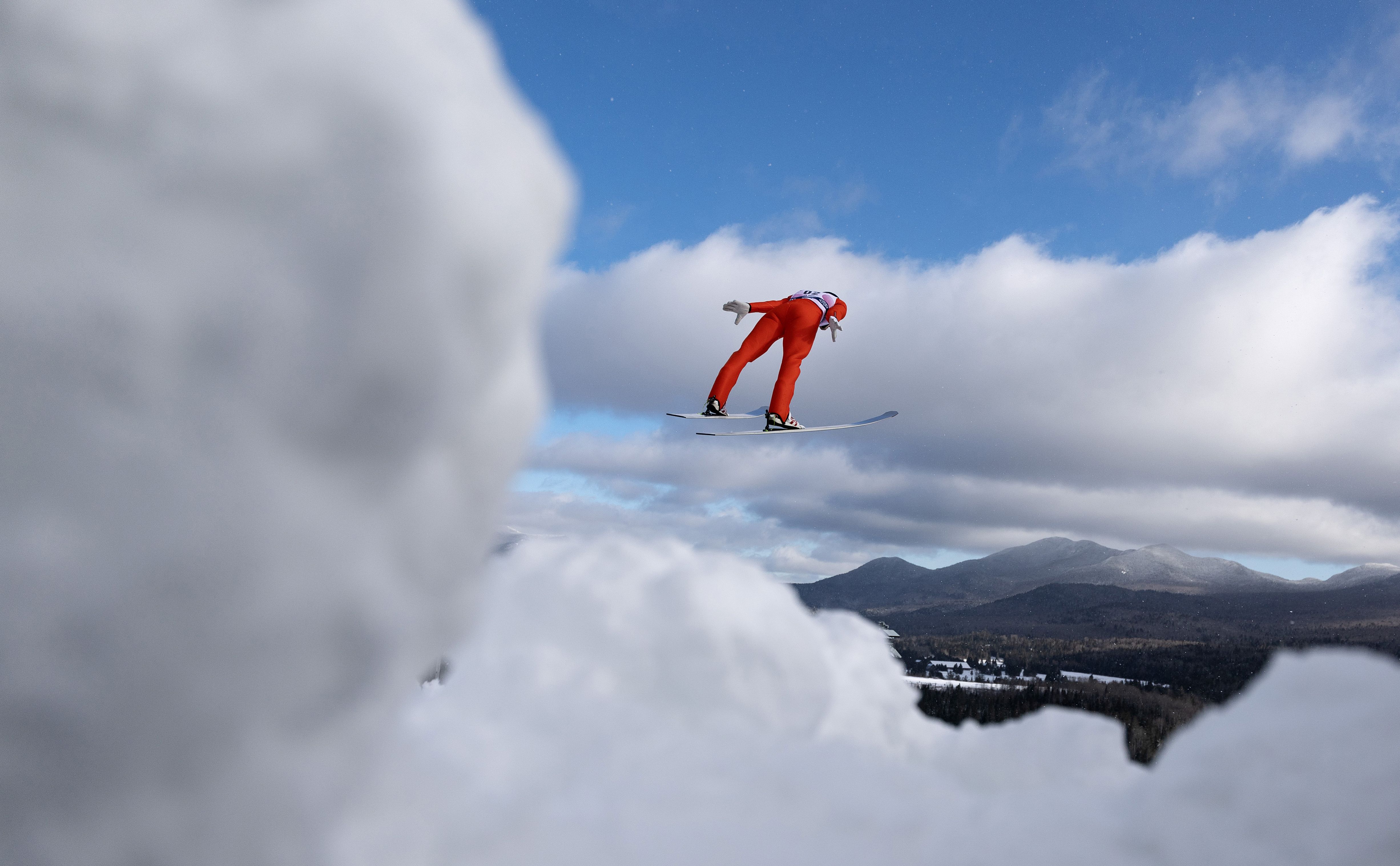Yanick Wasser of Switzerland jumps in the Mens Large Hill Individual competition during Day 2 of the FIS Ski Jumping World Cup at Lake Placid Olympic Jumping Complex on February 08, 2025 in Lake Placid, New York. (Photo by Al Bello/Getty Images)