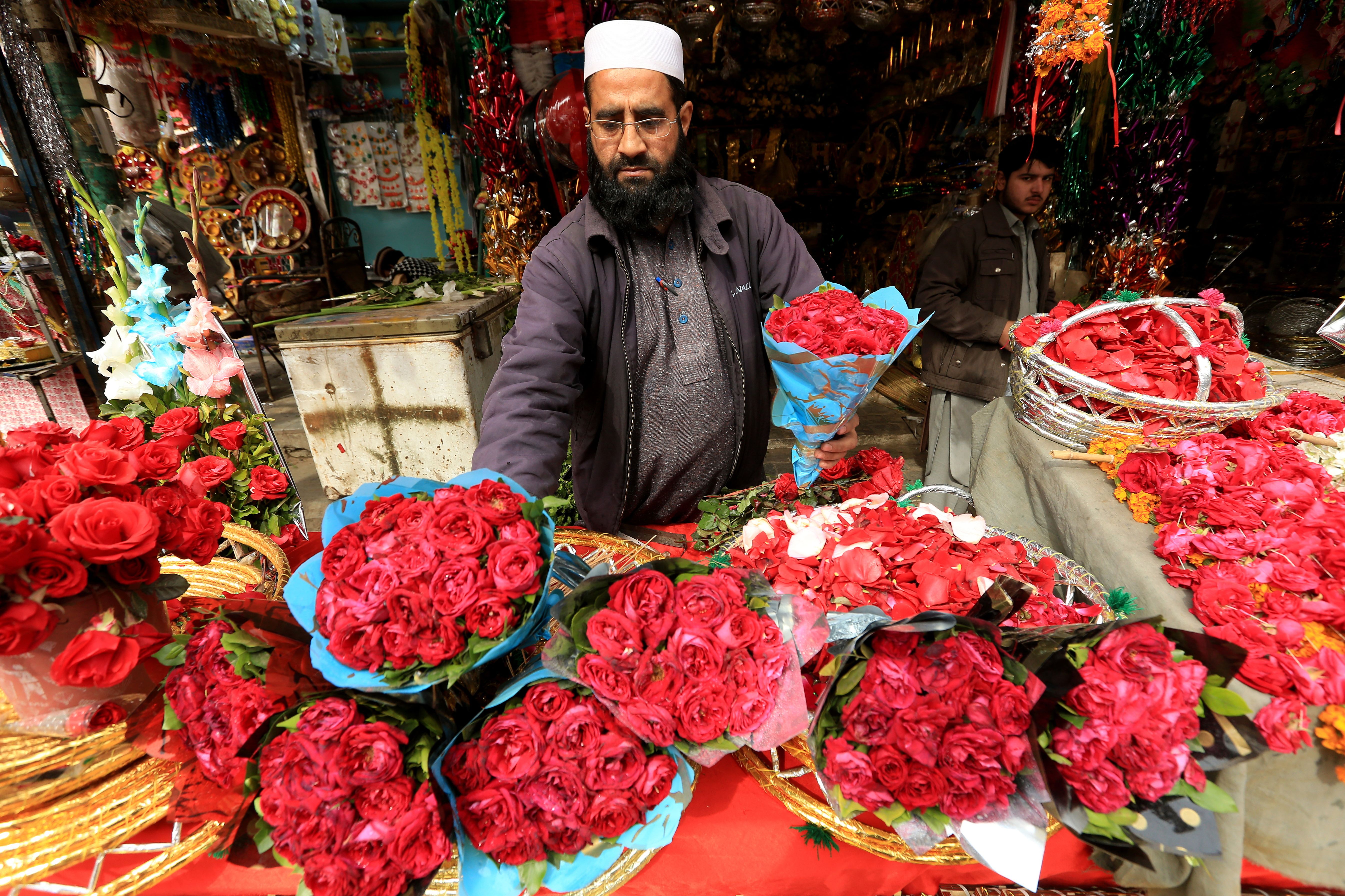 A vendor sells flowers during Valentine's Day in Peshawar, Pakistan, 14 February 2025. Valentine's Day, which traditionally is celebrated worldwide on 14 February, is considered to be un-Islamic in Pakistan. (Photo by Bilawal Arbab/EPA)