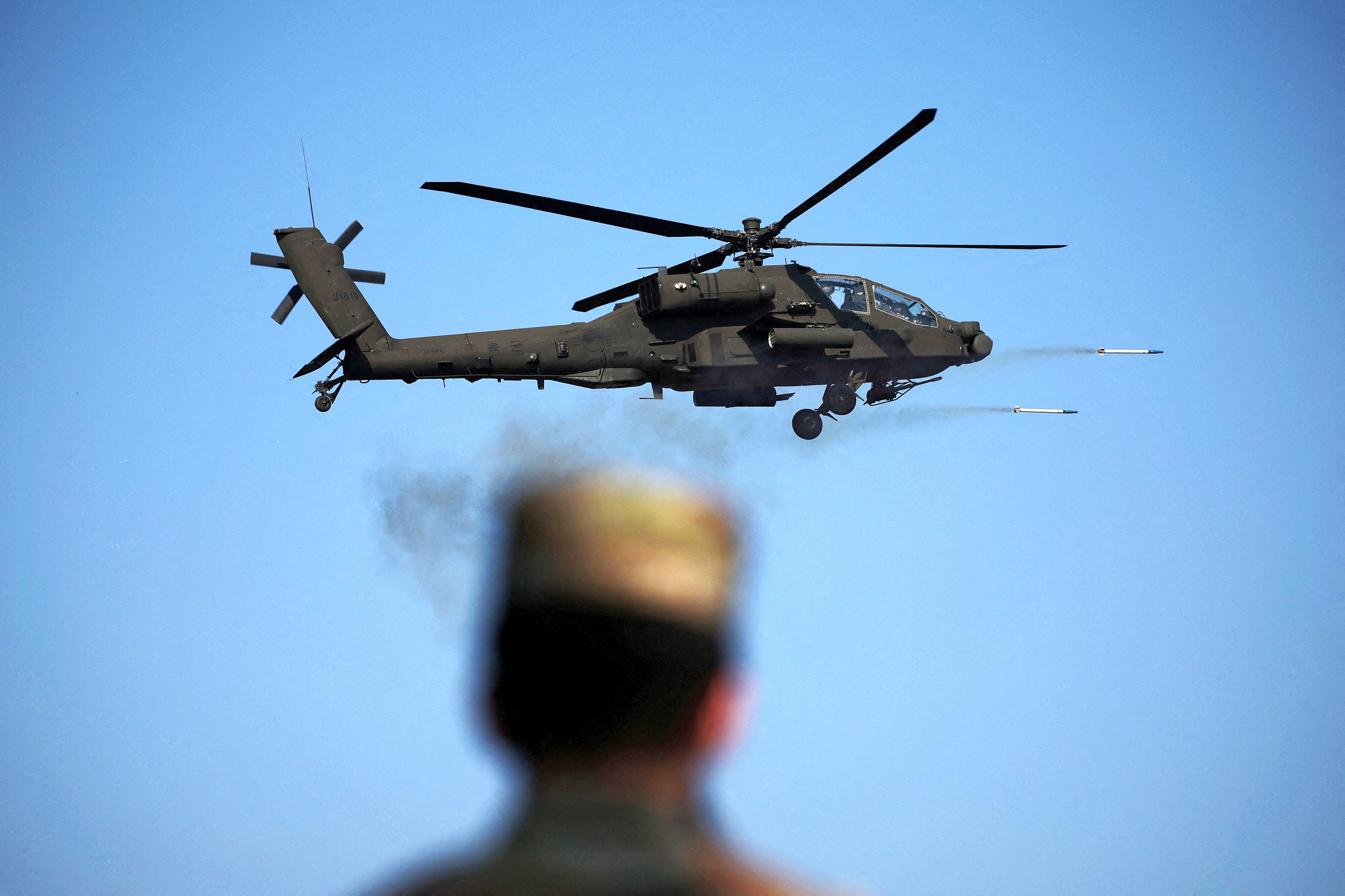 A U.S. soldier looks on at an AH-64E Apache helicopter of the South Korean army firing missiles during a combined live fire drill between South Korea and U.S. army at the Rodriguez Live Fire Complex, in Pocheon, South Korea on October 30, 2024. (Photo by Kim Hong-Ji/Reuters)