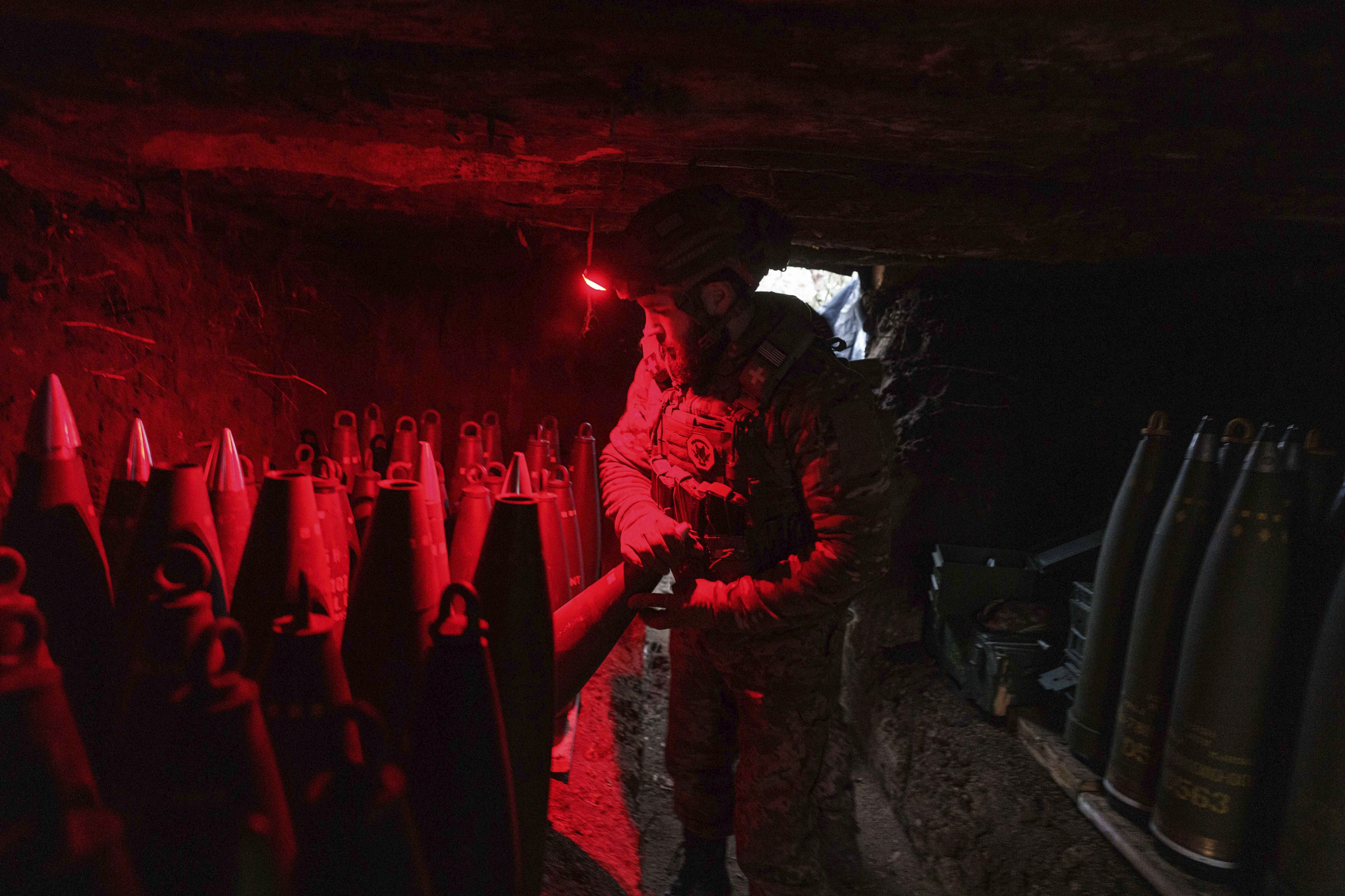 A Ukrainian serviceman of the 148th artillery brigade prepares 155mm artillery shells for a M777 howitzer before firing towards Russian positions at the frontline on Velyka Novosilka direction, Donetsk region, Ukraine, January 26, 2025. (Photo by Evgeniy Maloletka/AP Photo)
