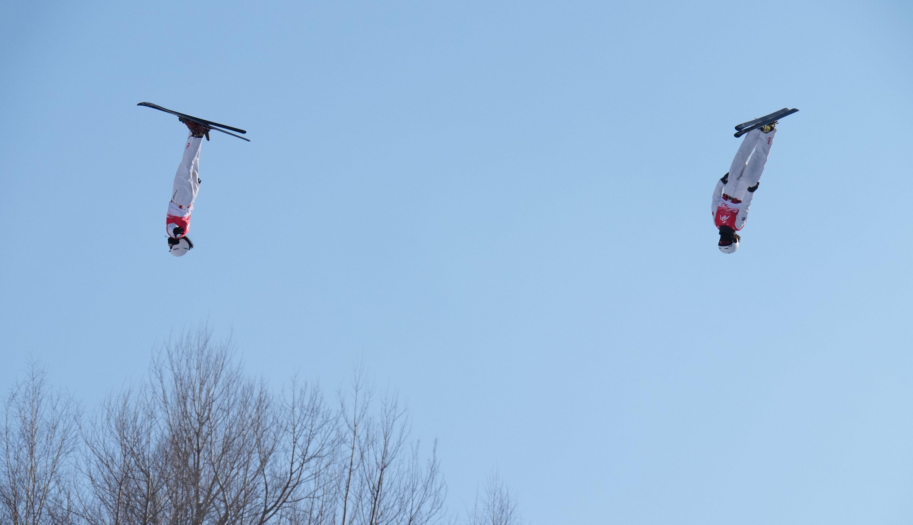 Feng Junxi/Wang Xue (R) of China compete during the Freestyle Skiing women's aerials synchro final at the 9th Asian Winter Games in Yabuli, northeast China's Heilongjiang Province, February 11, 2025. (Photo by Wang Song/Xinhua/Alamy Live News)