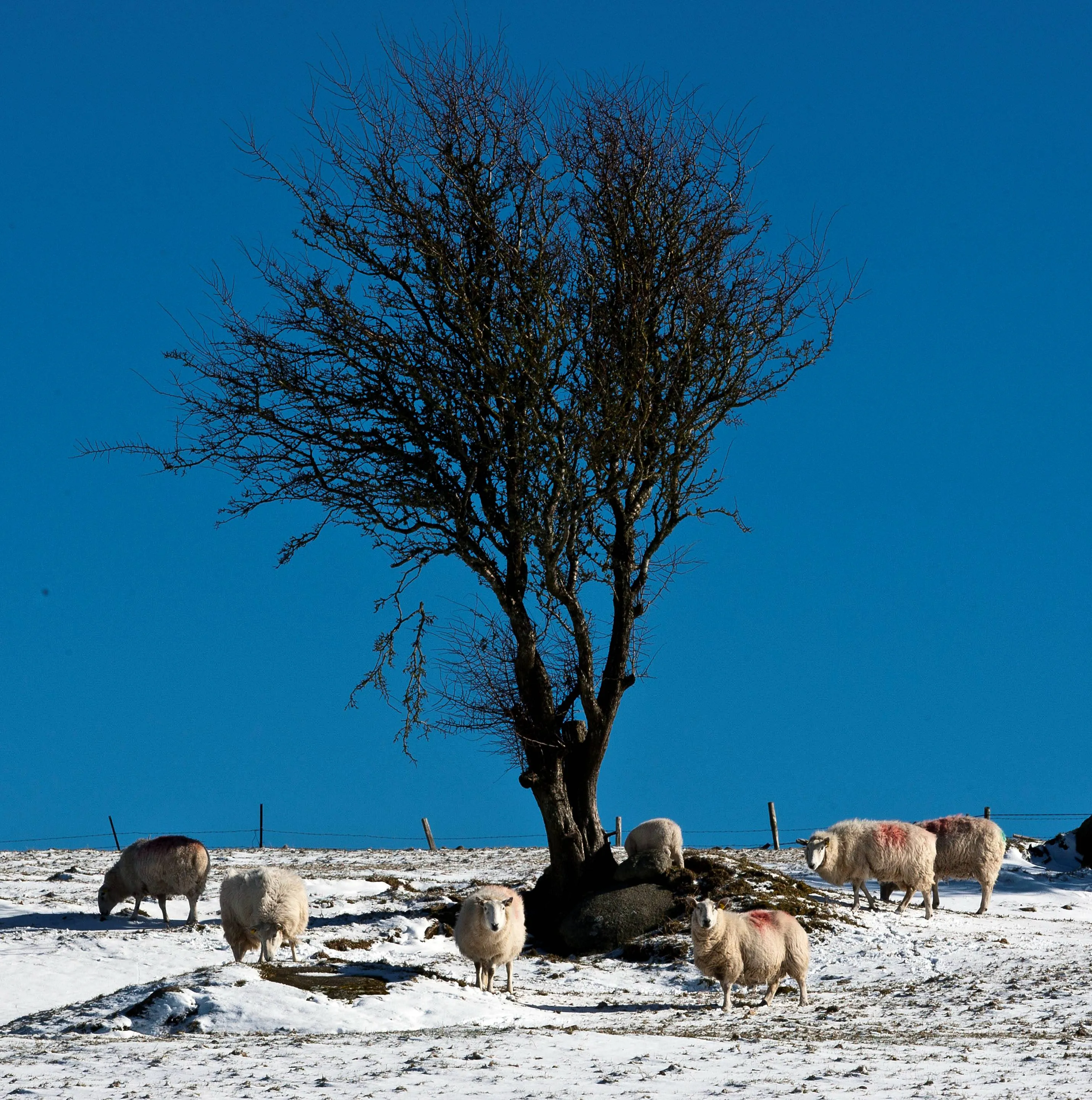 Sheep look for grazing in the snow covered fields, Ballyknockan, Co Wicklow, UK, on March 12, 2013. (Photo by Garry O'Neill)