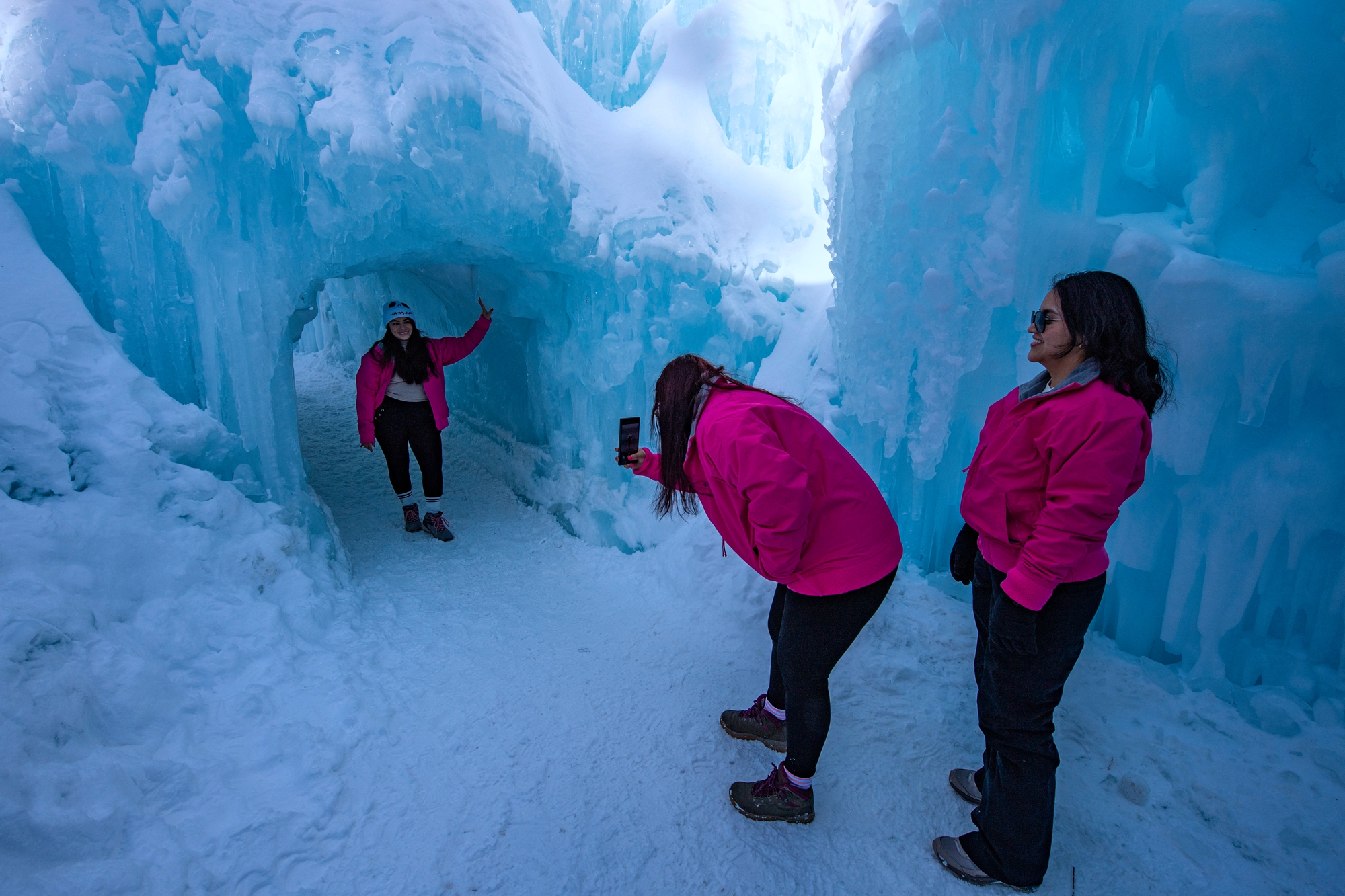People trek through the caverns and snow at Ice Castles in North Woodstock, New Hampshire on February 8, 2025. Founder Brent Christensen, crafted his first icy creation in the front yard of his home to bring happiness and joy to his children. Since 2011, Ice Castles has been dedicated to creating a world of ice caves, frozen waterfalls, and glaciers formed into archways, caverns, slides, and tunnels. (Photo by Joseph Prezioso/AFP Photo)