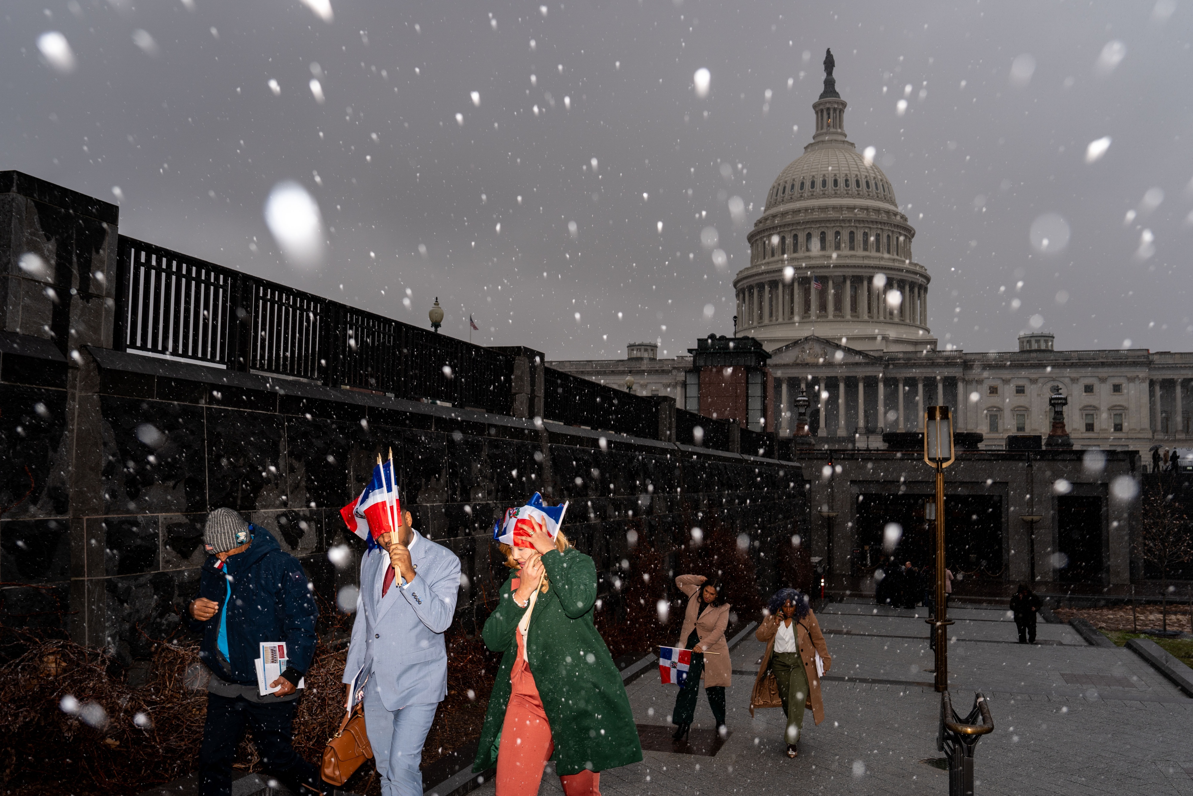 People shield themselves from the snow with flags of the Dominican Republic as snow falls over the U.S. Capitol on February 11, 2025 in Washington, DC. Snowfall is expected to intensify this evening across the D.C. region, with accumulations of three to six inches and higher totals further south, creating hazardous travel conditions. (Photo by Kent Nishimura/Getty Images)