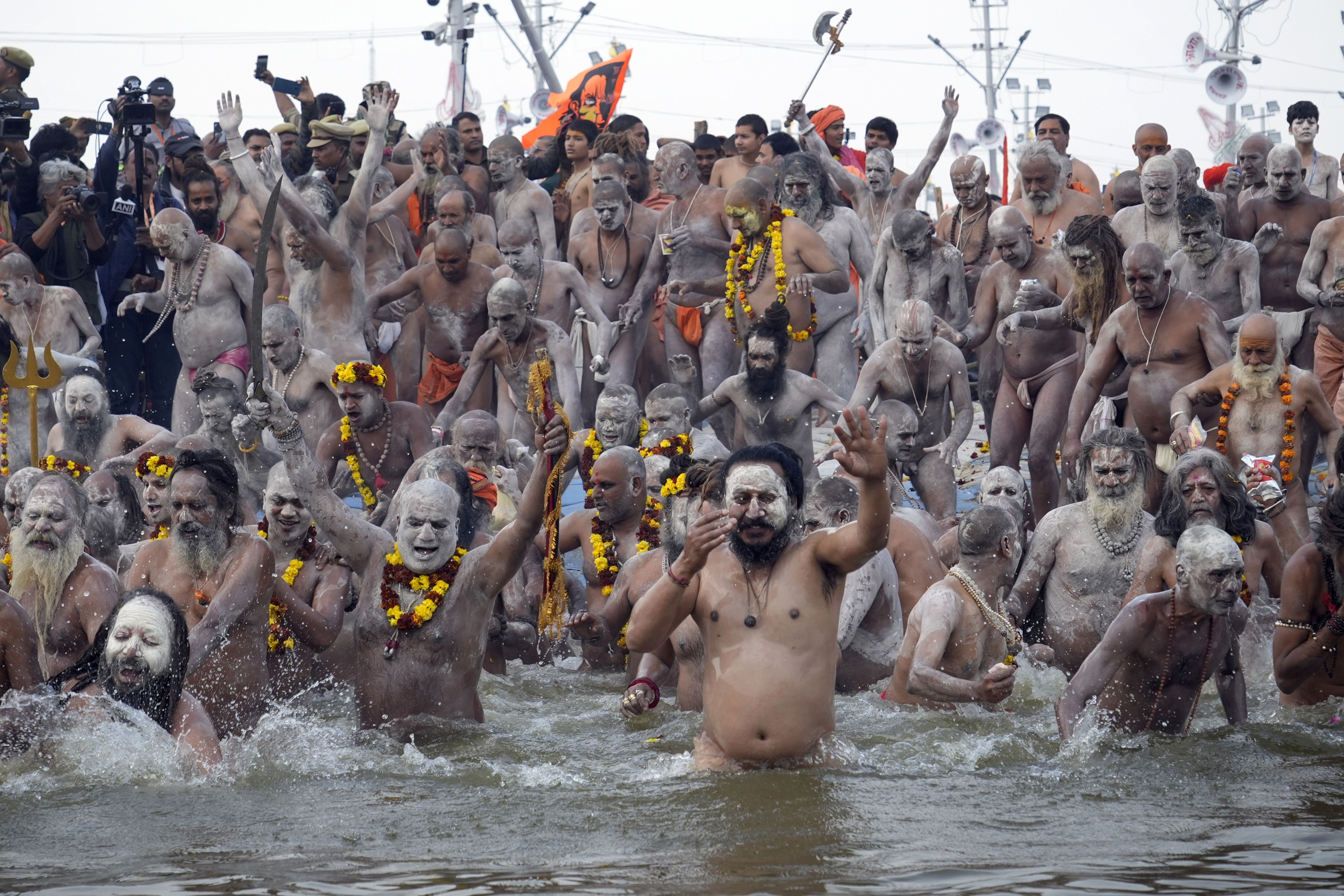 Naga Sadhus or naked Hindu holy men, they take a holy dip in the Sangam, the confluence of the Ganges, the Yamuna and the mythical Saraswati rivers, on “Mauni Amavasya” or new moon day during the Maha Kumbh festival in Prayagraj, India, Wednesday, January 29, 2025. (Photo by Deepak Sharma/AP Photo)