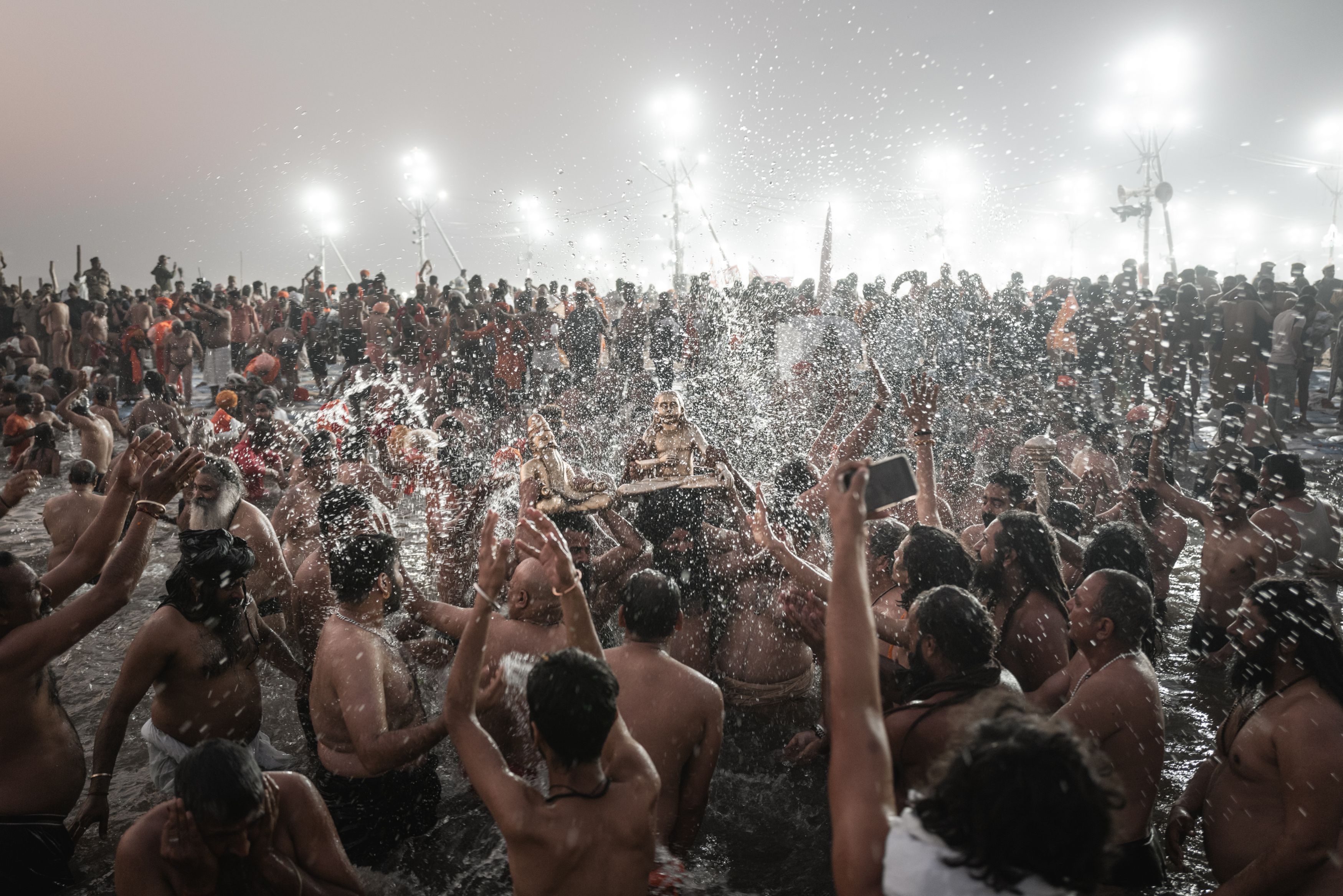 Naga Sadhus take a royal bath, Shahi Snans, on Mauni Amavasya on January 29, 2025 in Allahabad, India. The bathing was postponed by more than 12 hours after a deadly stampede occurred in the morning. Kumbh Mela in 2025 is a Maha Kumbh, which is a significant Hindu festival celebrated once every 144 years at Prayagraj (Allahabad). Scheduled from January 13 to February 26, 2025, it attracts millions of devotees for ritual bathing at the confluence of the Ganges, Yamuna, and the mythical Saraswati rivers, marking a unique spiritual occasion with enhanced significance compared to regular Kumbh Mela. (Photo by Elke Scholiers/Getty Images)