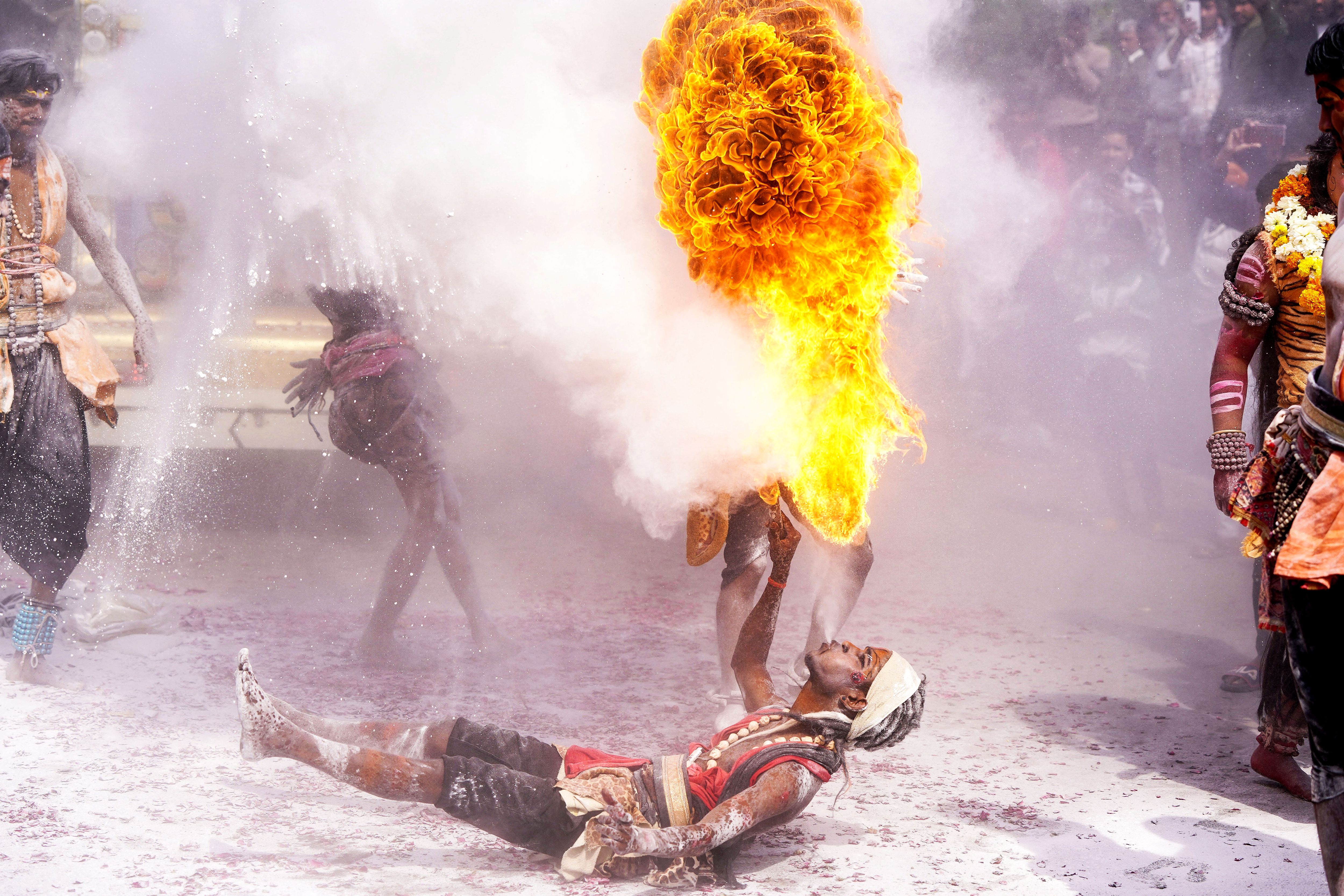 Revellers perform a fire-breathing stunt during a religious procession celebrating the birth anniversary of Hindu folk deity Lord Devnarayan, or “Devnarayan Jayanti”, in Ajmer on February 4, 2025. (Photo by Himanshu Sharma/AFP Photo)