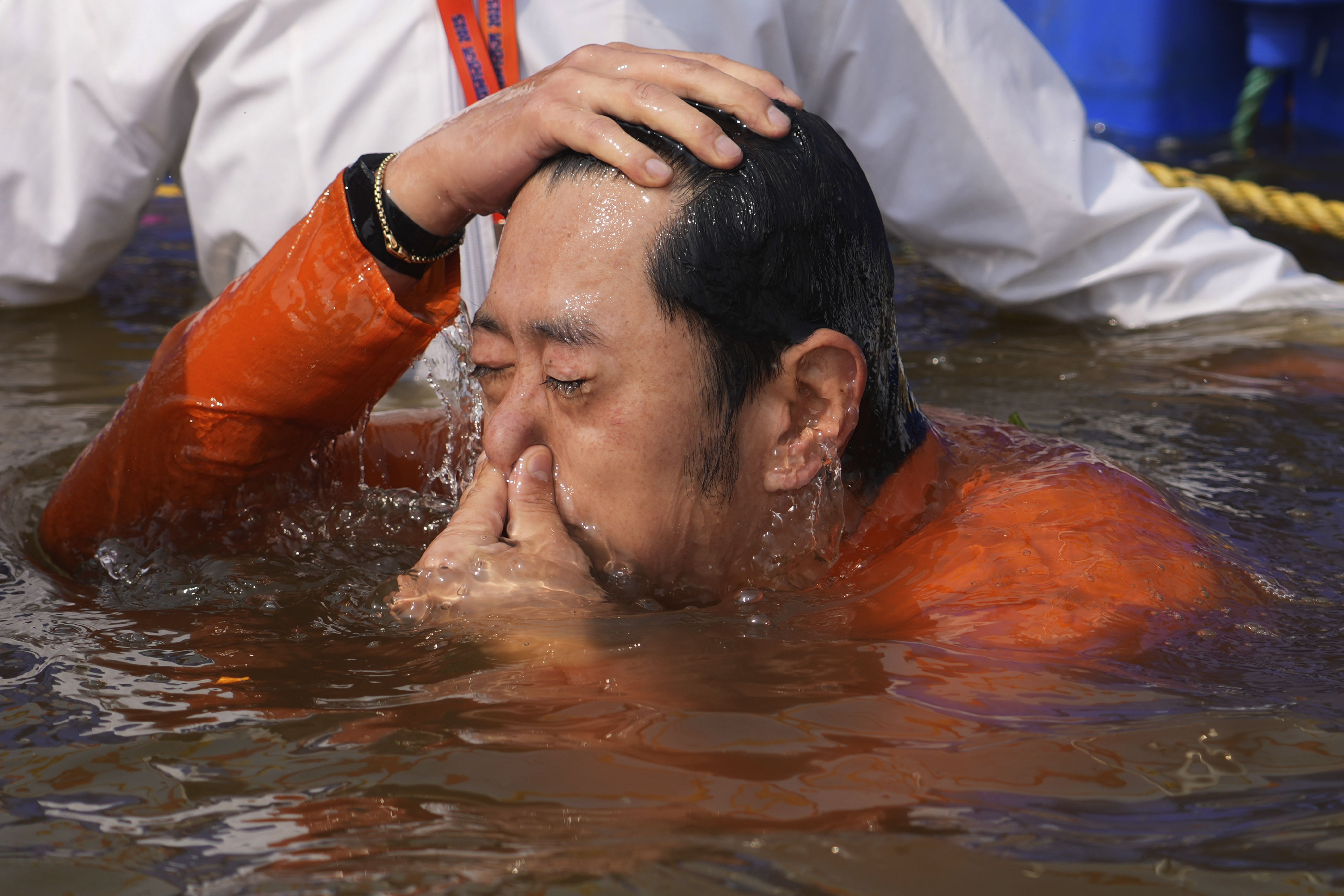 Bhutan's King Jigme Khesar Namgyel Wangchuck, takes ritualistic dips at Sangam, the confluence of rivers Ganges, Yamuna and mythical Saraswati during the Maha Kumbh festival in Prayagraj, India, Tuesday, February 4, 2025. (Photo by Rajesh Kumar Singh/AP Photo)