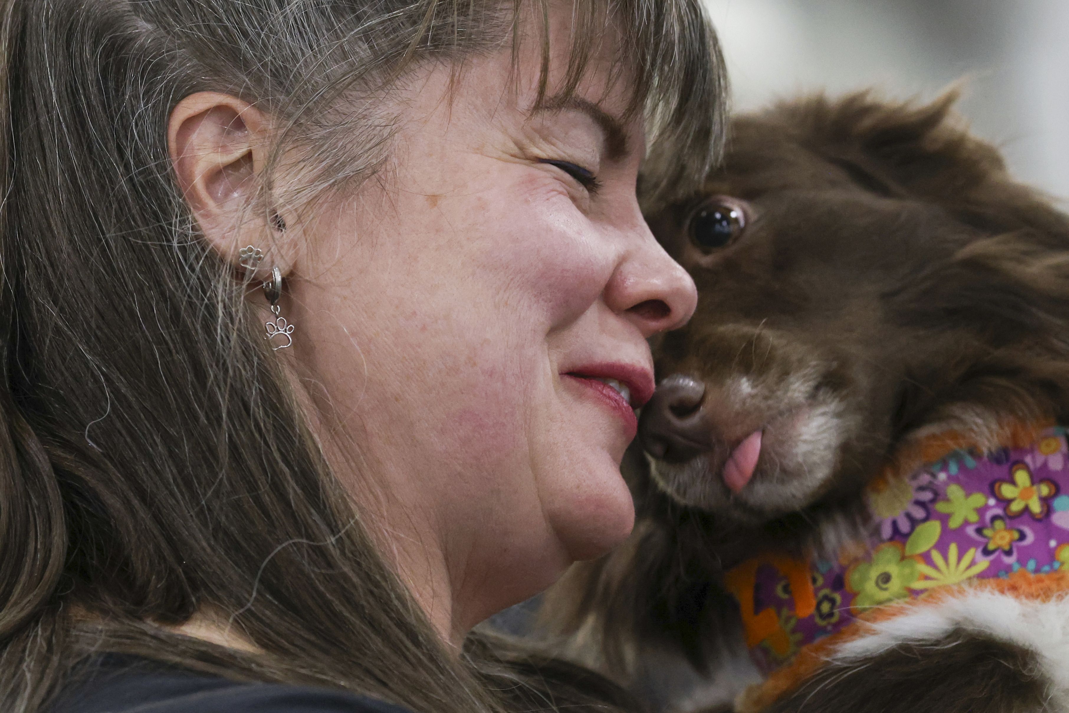 Alicia Bismore with her dog Dazy, waits for the flyball tournament at the 149th Westminster Kennel Club Dog show, Saturday, February 8, 2025, in New York. (Photo by Heather Khalifa/AP Photo)