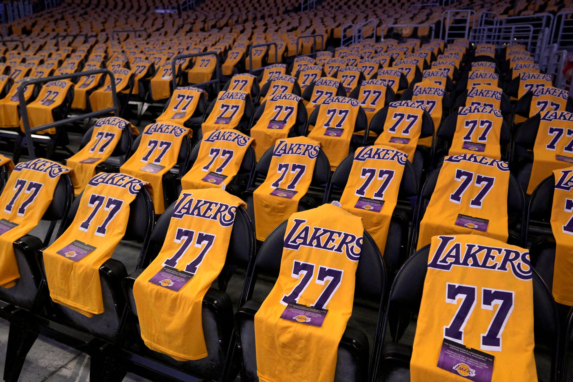 Photo of jerseys with the number 77 of the Lakers, during an NBA game between the Los Angeles Lakers and Utah Jazz at the Crypto.com Arena in Los Angeles, United States, 11 February 2025. Luka Doncic's arrival in Los Angeles marked a new chapter in the history of thousands of fans who attended the Lakers' arena to enjoy his long-awaited debut against the Utah Jazz and take home an enviable “souvenir”: the jersey of the new LA star. (Photo by USA TODAY Sports via Reuters Con)
