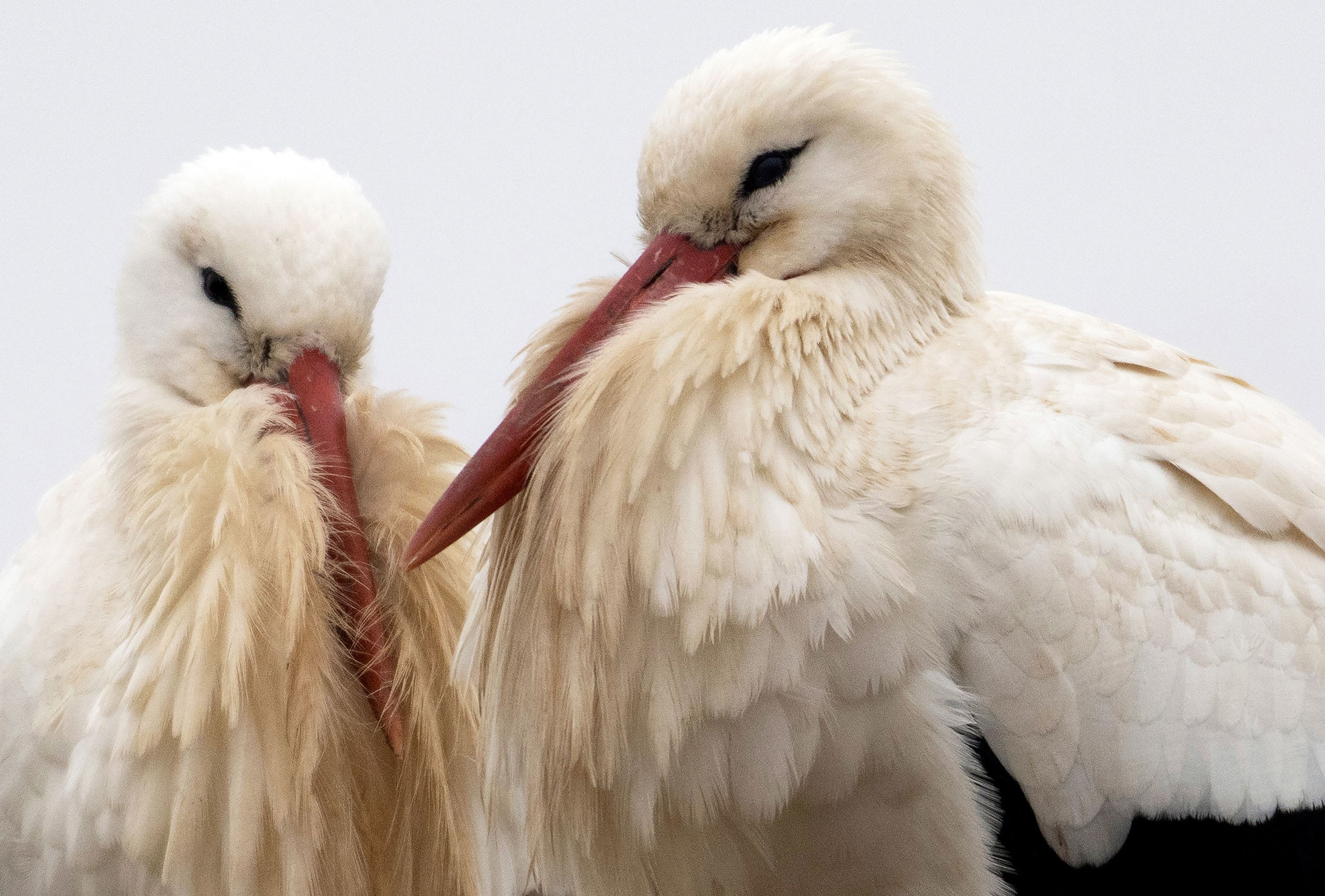 Two white storks sit on their nest in Biebesheim am Rhein, Germany, on Wednesday, February 5, 2025. (Photo by Boris Roessler/DPA/Picture Alliance/Getty Images)