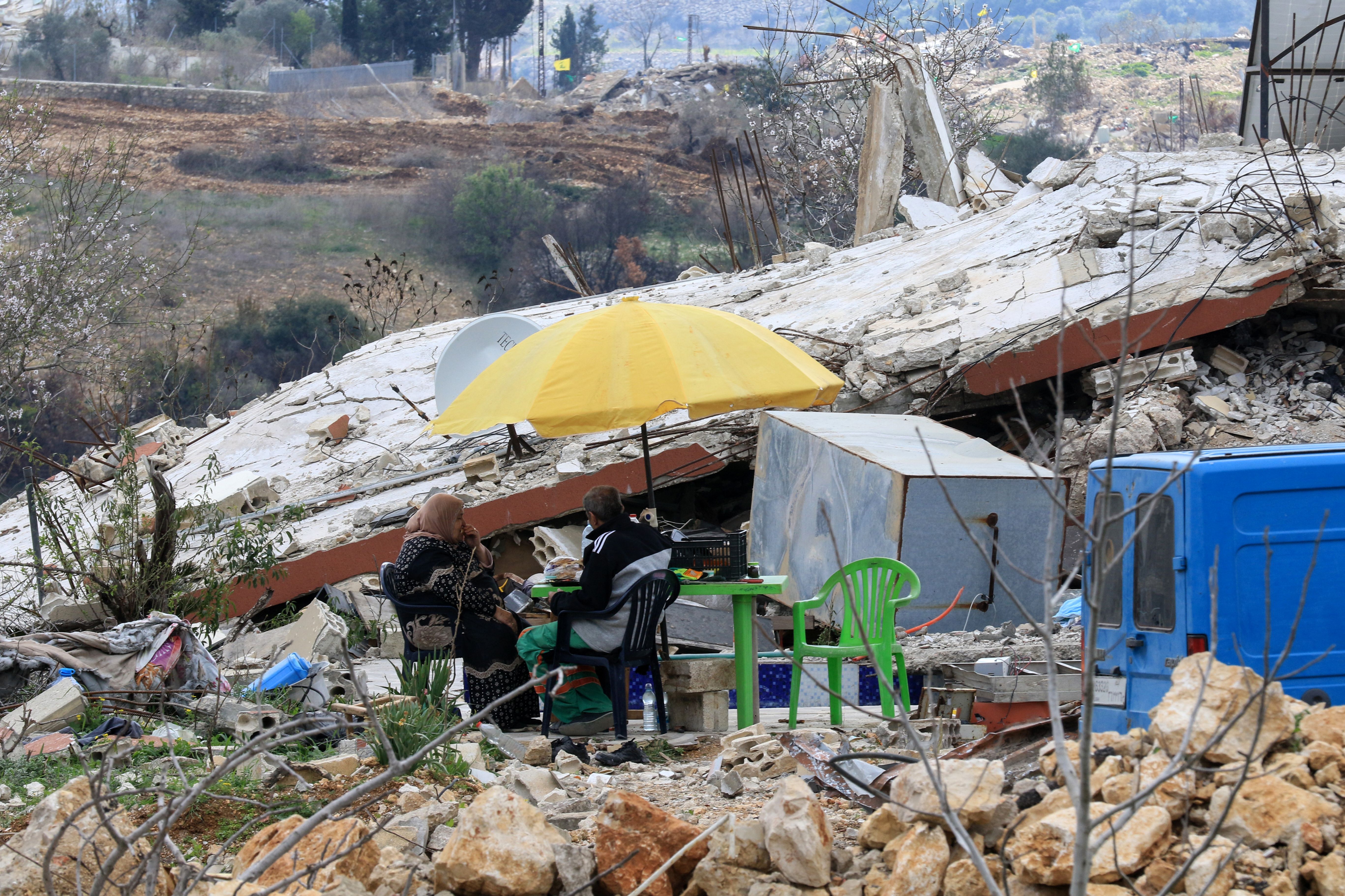 People sit around a table, set up atop the rubble of their house that was destroyed during the recent war between Israel and Hezbollah, in the village of al Jibbain in southern Lebanon on January 31, 2025. (Photo by Mahmoud Zayyat/AFP Photo)