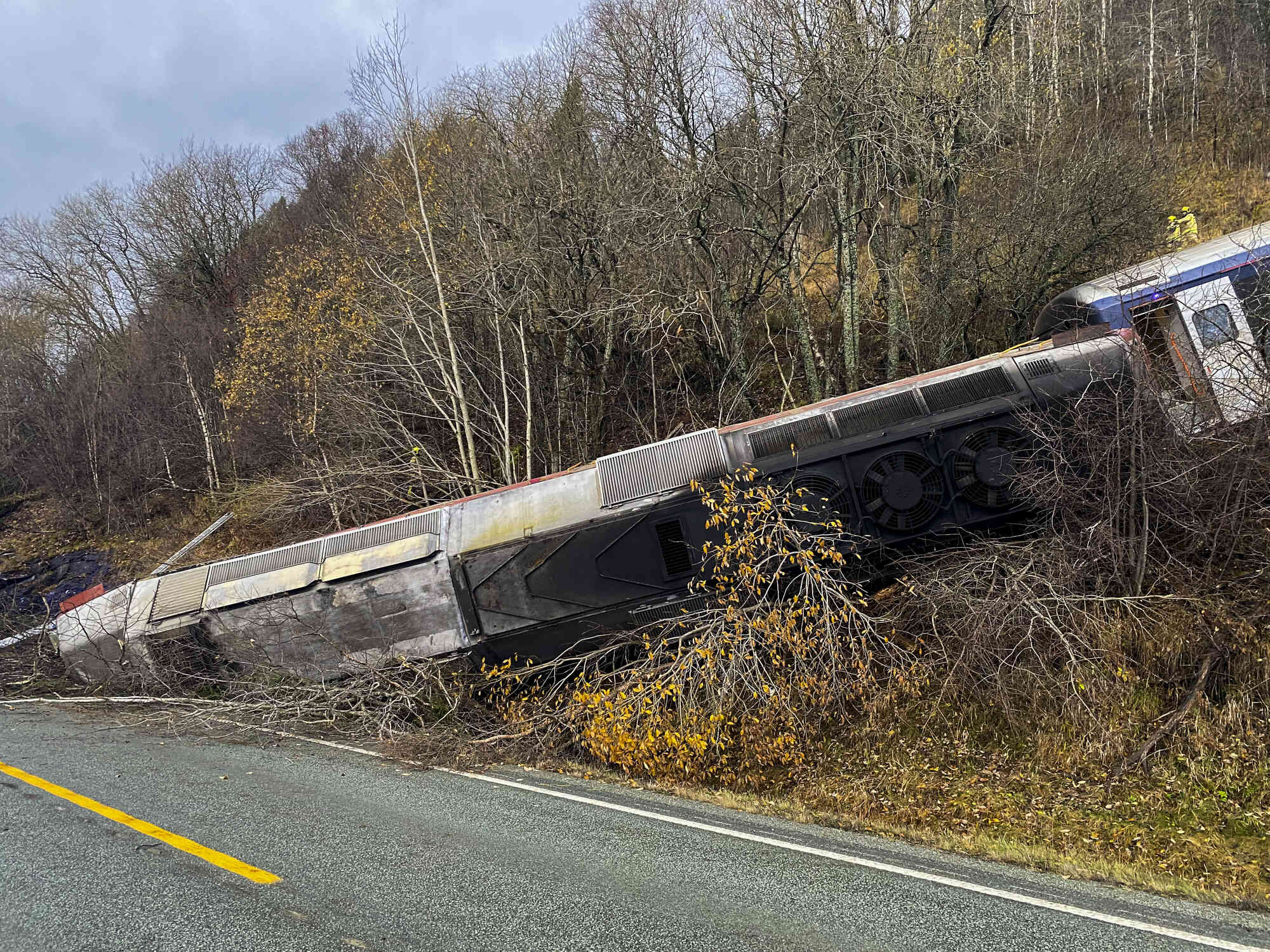 Several people were injured in the train derailment at Finneidfjord in Nordland, Norway, on Wednesday afternoon, the police said, Thursday, October 24, 2024. The derailment is probably caused by a rock slide. (Photo by Jan Kenneth Transeth/NTB Scanpix via AP Photo)