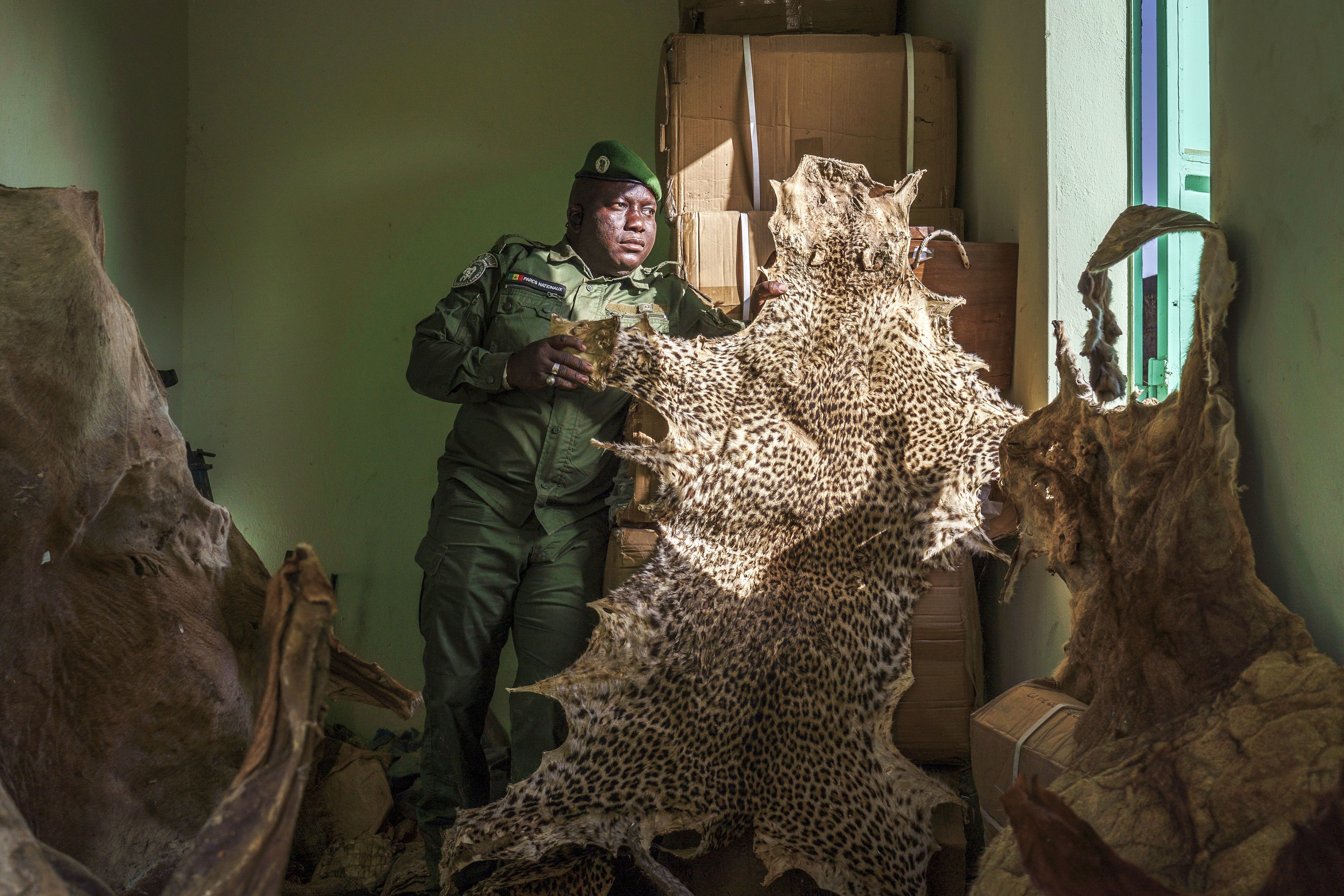 Ousmane Sambou, a sergeant with Senegal's Direction of National Parks, holds up a confiscated leopard skin at the DPN headquarters in Tambacounda, Senegal on Monday, January 13, 2025. (Photo by Annika Hammerschlag/AP Photo)