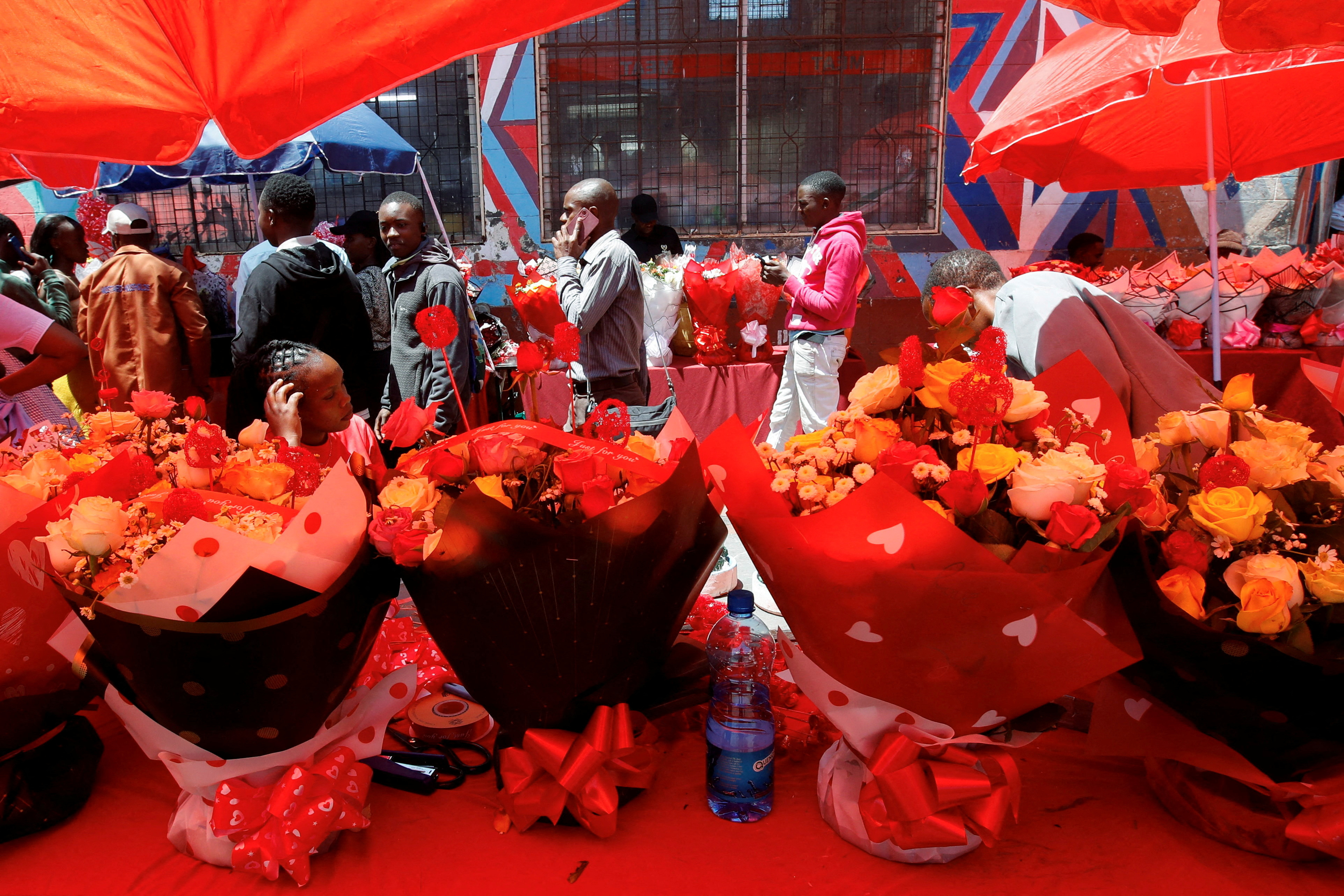 People walk past bouquets displayed for sale to mark Valentine's Day celebrations in Nairobi, Kenya, on February 14, 2025. (Photo by Monicah Mwangi/Reuters)