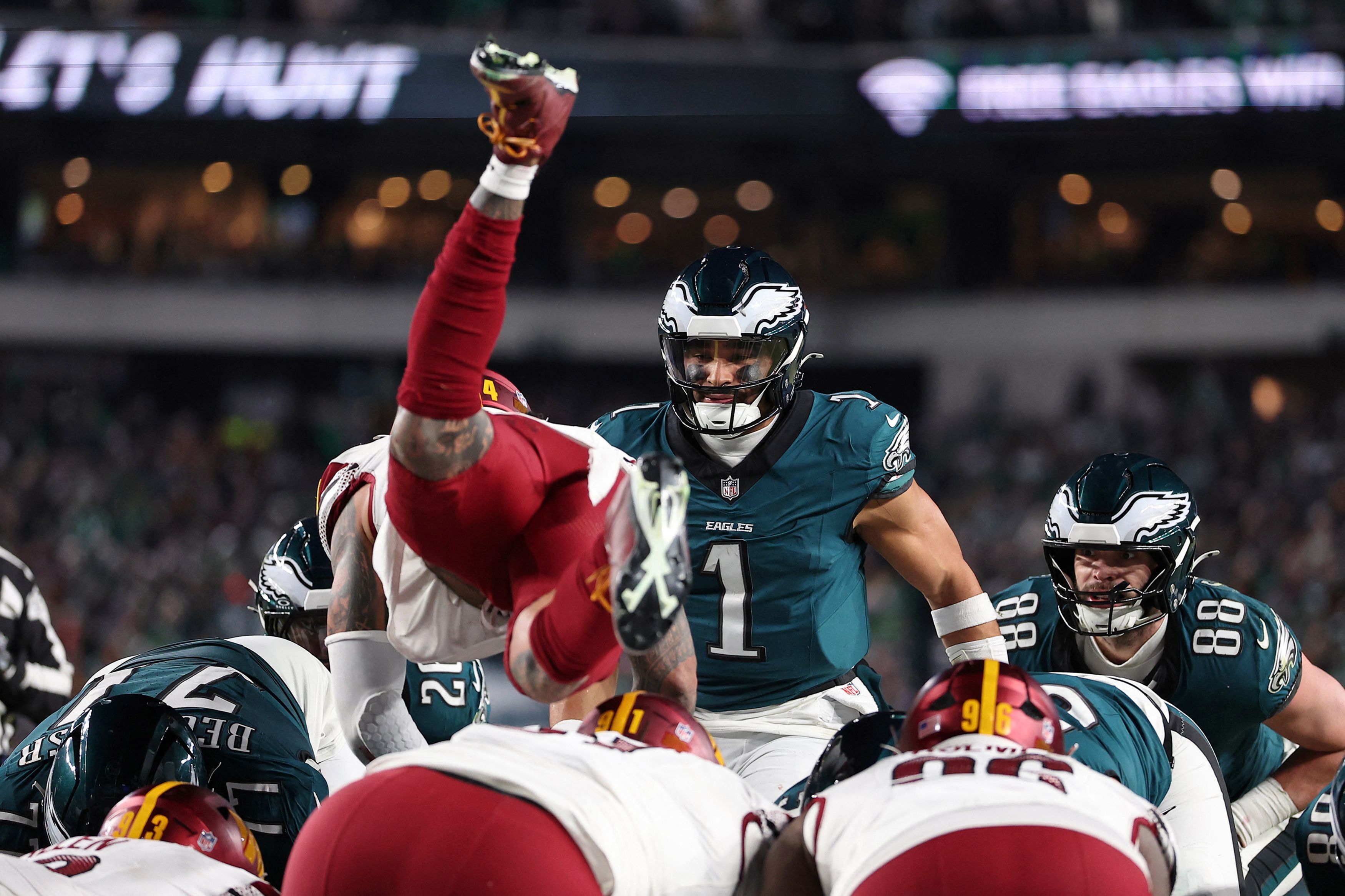 Washington Commanders linebacker Frankie Luvu dives over the line of scrimmage before a play in the NFC Championship game on Sunday, January 26, 2025. Luvu was penalized for offside, and the Eagles eventually scored a touchdown from less than a yard away. The Eagles won 55-23 to book a spot in the Super Bowl. They’ll play the Kansas City Chiefs in a rematch from two years ago. (Photo by Bill Streicher/USA Today/Imagn Images via Reuters)