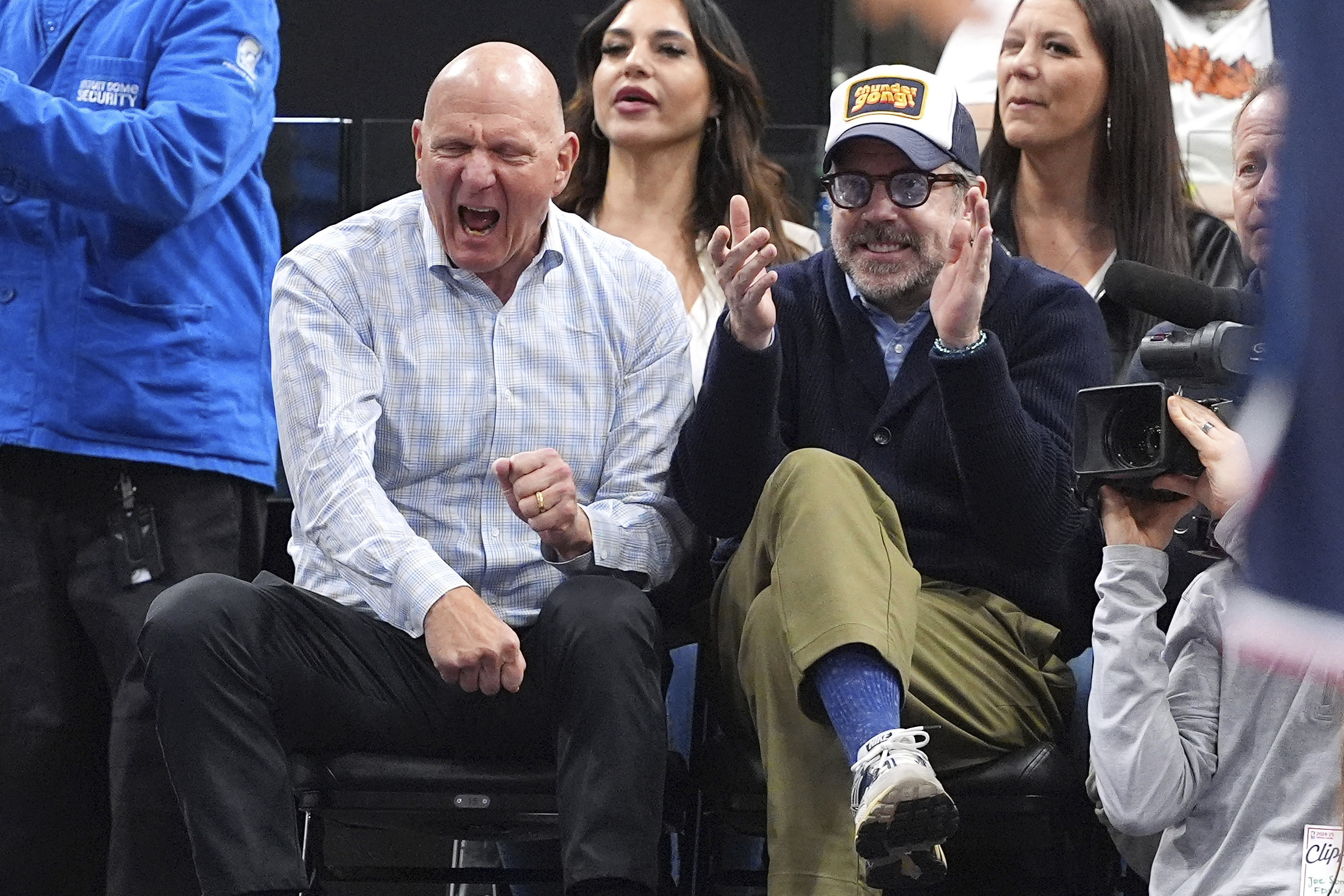 Los Angeles Clippers owner Steve Ballmer, left, and actor Jason Sudeikis celebrate after the Clippers scored during the second half of an NBA basketball game against the Memphis Grizzlies, Wednesday, February 12, 2025, in Inglewood, Calif. (Photo by Mark J. Terrill/AP Photo)