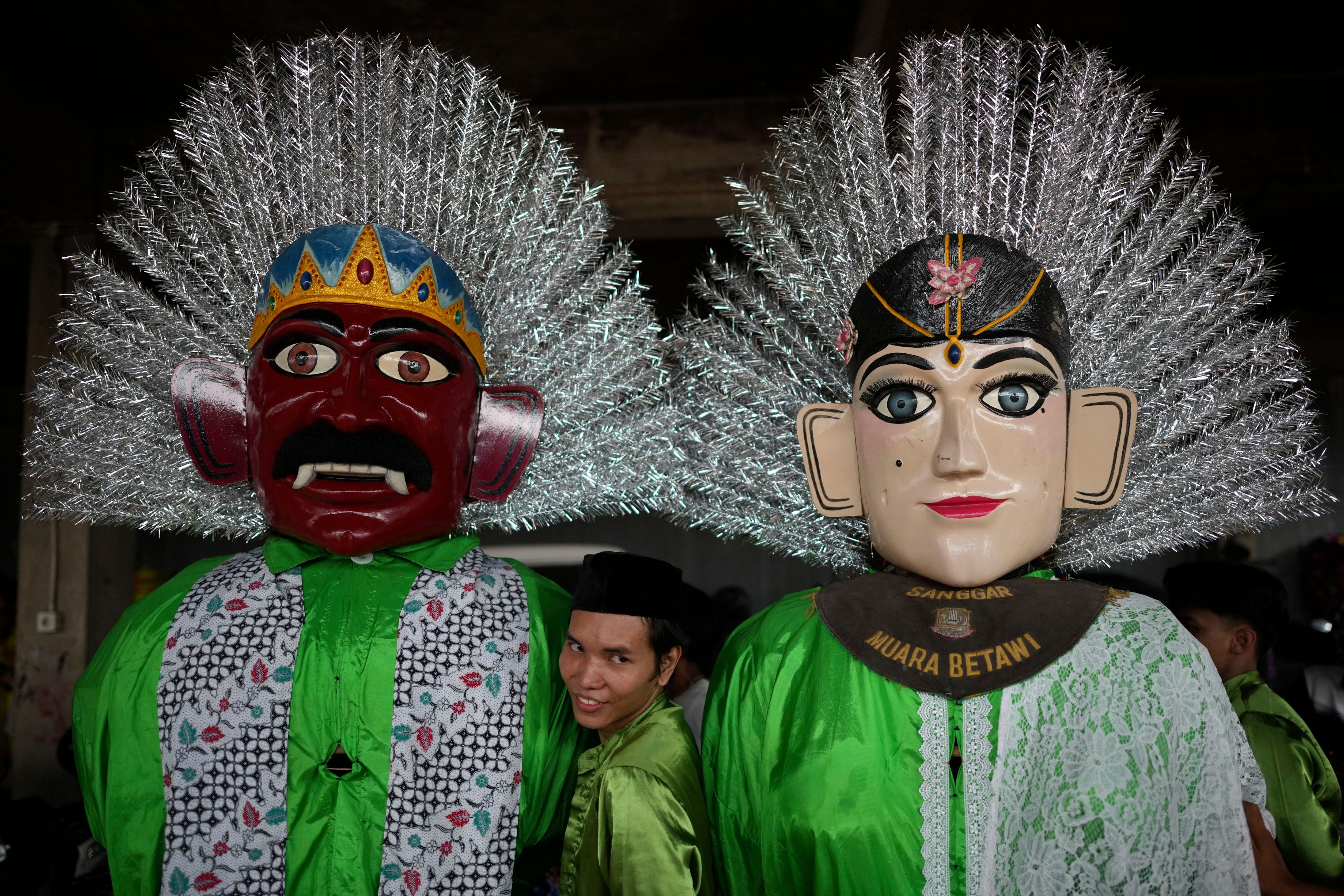 A performer prepares traditional giant effigies called “ondel-ondel”, during Cap Go Meh festival, an annual event held on the 15th day after the Chinese New Year to mark the end of its celebration period, in Bekasi, Indonesia, Wednesday, February 12, 2025. (Photo by Dita Alangkara/AP Photo)