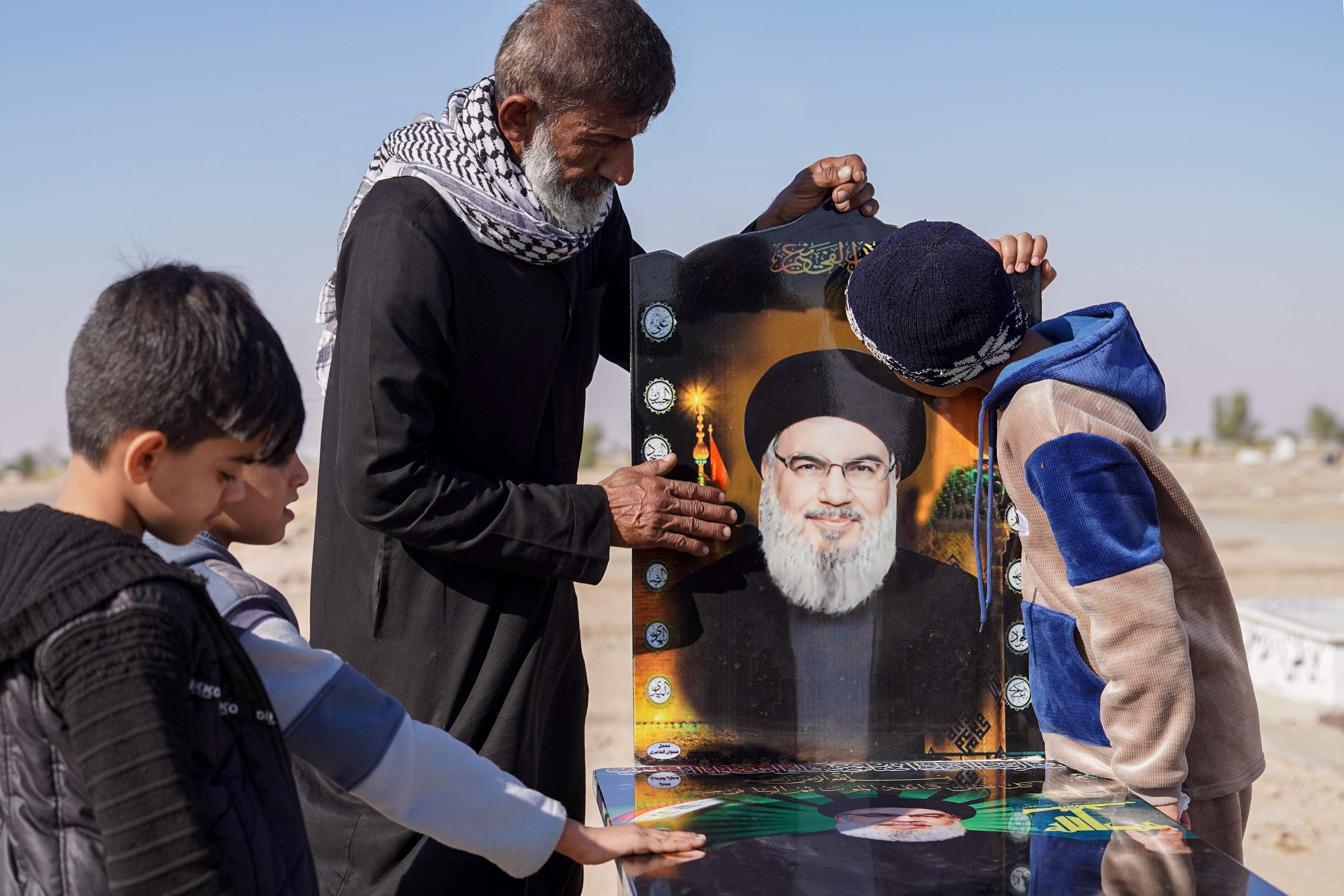 A man and children pray by a symbolic grave for slain Lebanon's Hezbollah leader Hasan Nasrallah in Iraq's Shiite holy city of Najaf, on November 15, 2024. Nasrallah was killed in an Israeli air strike on Beirut's southern suburbs on September 27, 2024, amid the ongoing war between Israel and Hezbollah. (Photo by Qassem Al-Kaabi/AFP Photo)
