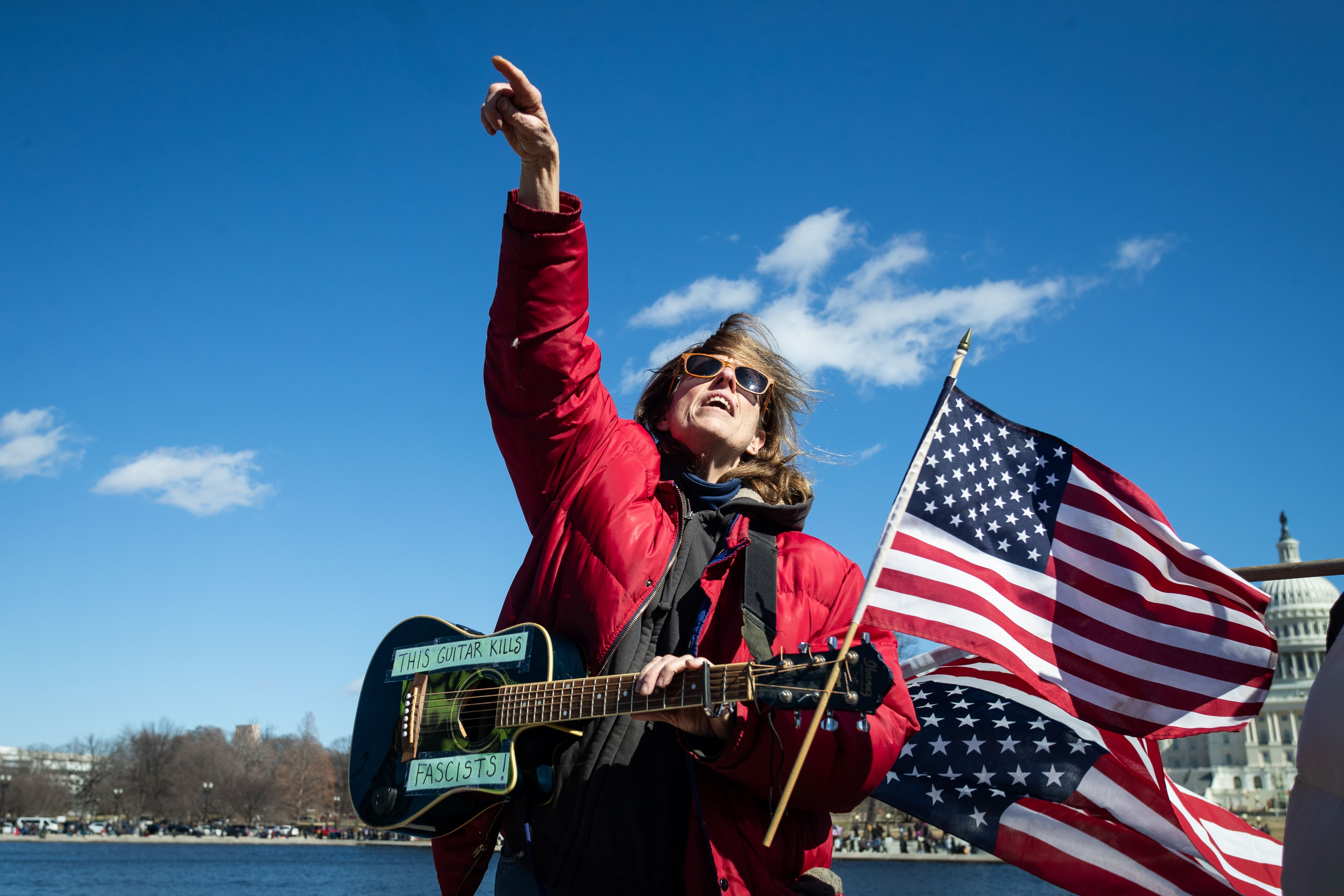 A woman sings during a protest outside the Capitol in Washington DC on February 18, 2025 against efforts by Donald Trump and Elon Musk to shrink the federal government. (Photo by Allison Bailey/NurPhoto/Rex Features/Shutterstock)