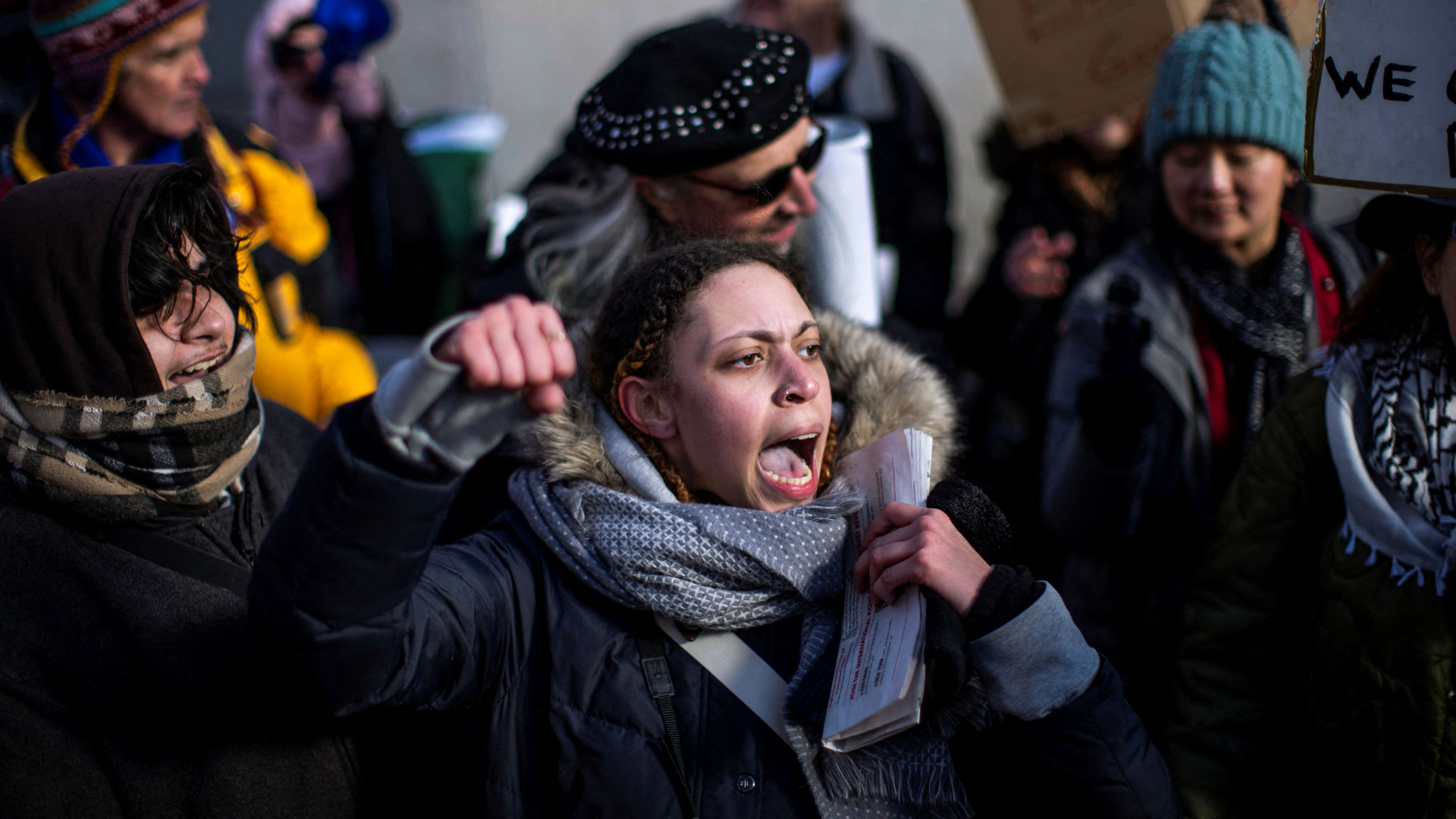 A protester shouts slogans against Trump as people participate in a National Day of Protest on Presidents' Day at Washington Square Park in New York City on February 17, 2025. (Photo by Eduardo Munoz/Reuters)
