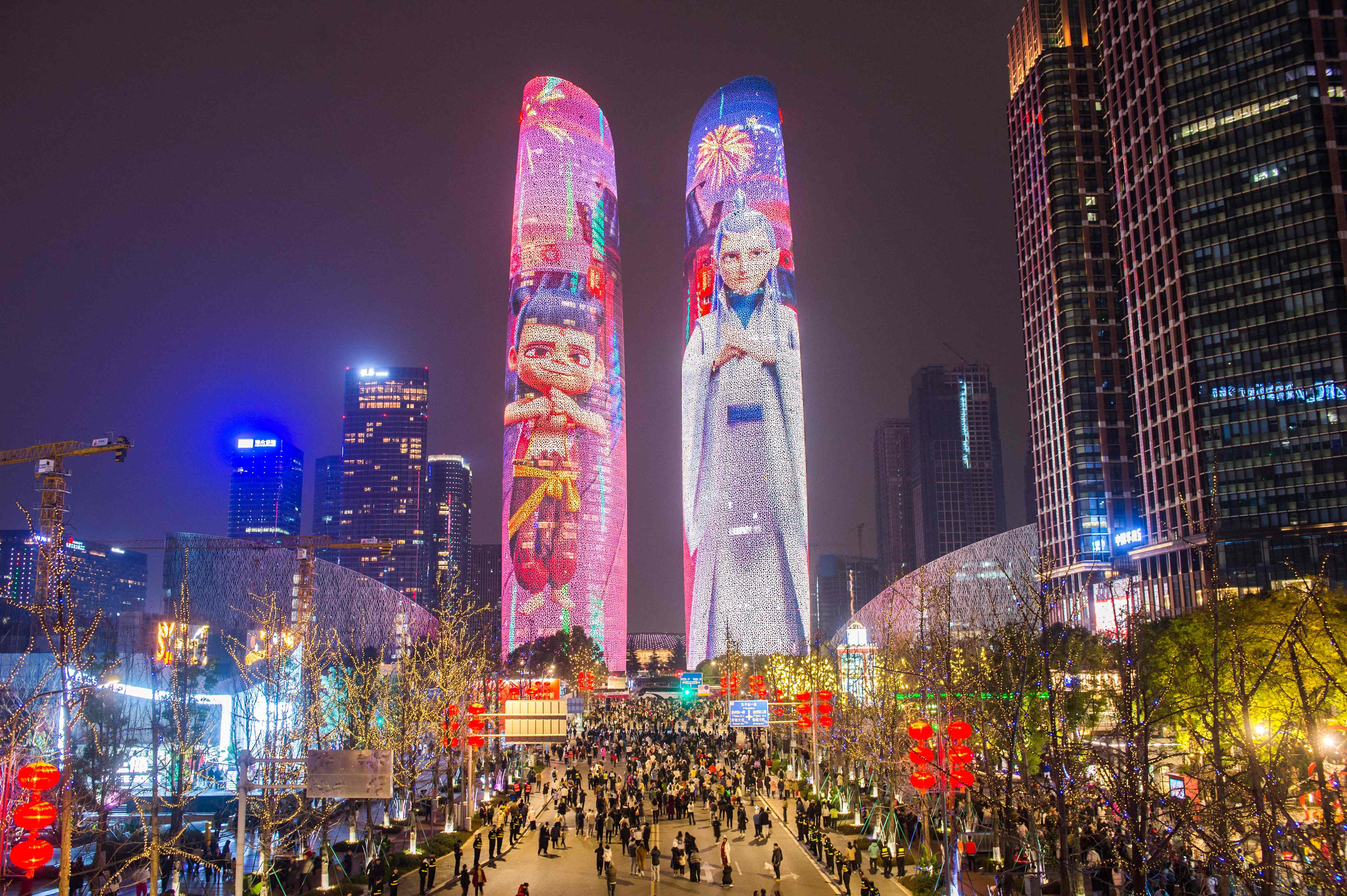 Buildings are lit up with characters from the movie “Ne Zha 2” in Chengdu, in China's southwest Sichuan province on February 12, 2025. Animated Chinese blockbuster “Ne Zha 2”, based on traditional mythology, has smashed multiple box office records on its way to becoming the country's most successful movie ever. (Photo by AFP Photo/China Stringer Network)