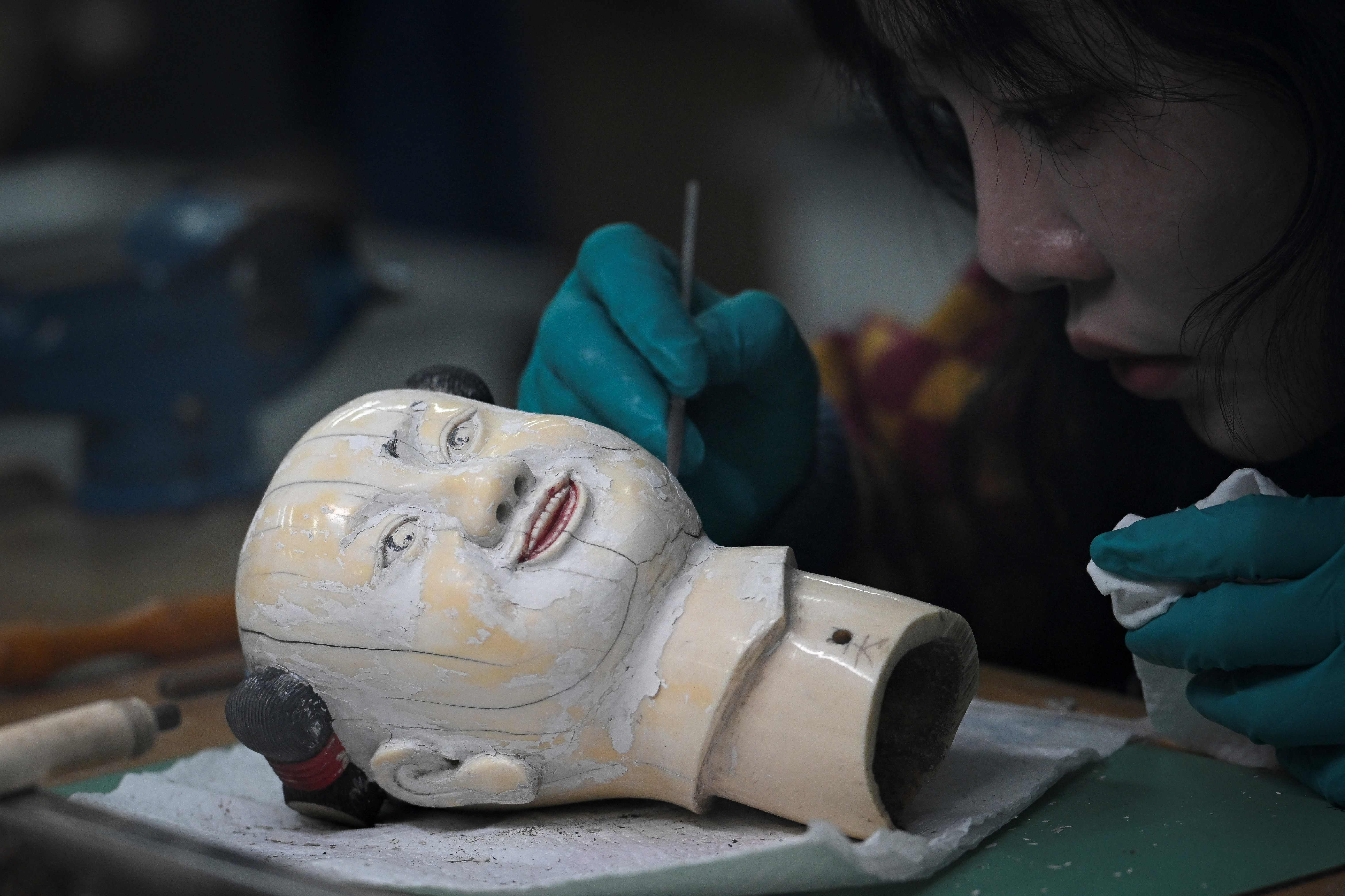 A restorer of cultural relics works at a restoration room of antique clocks at the Palace Museum during a media tour organized by the government in Beijing on February 21, 2025. (Photo by Wang Zhao/AFP Photo)