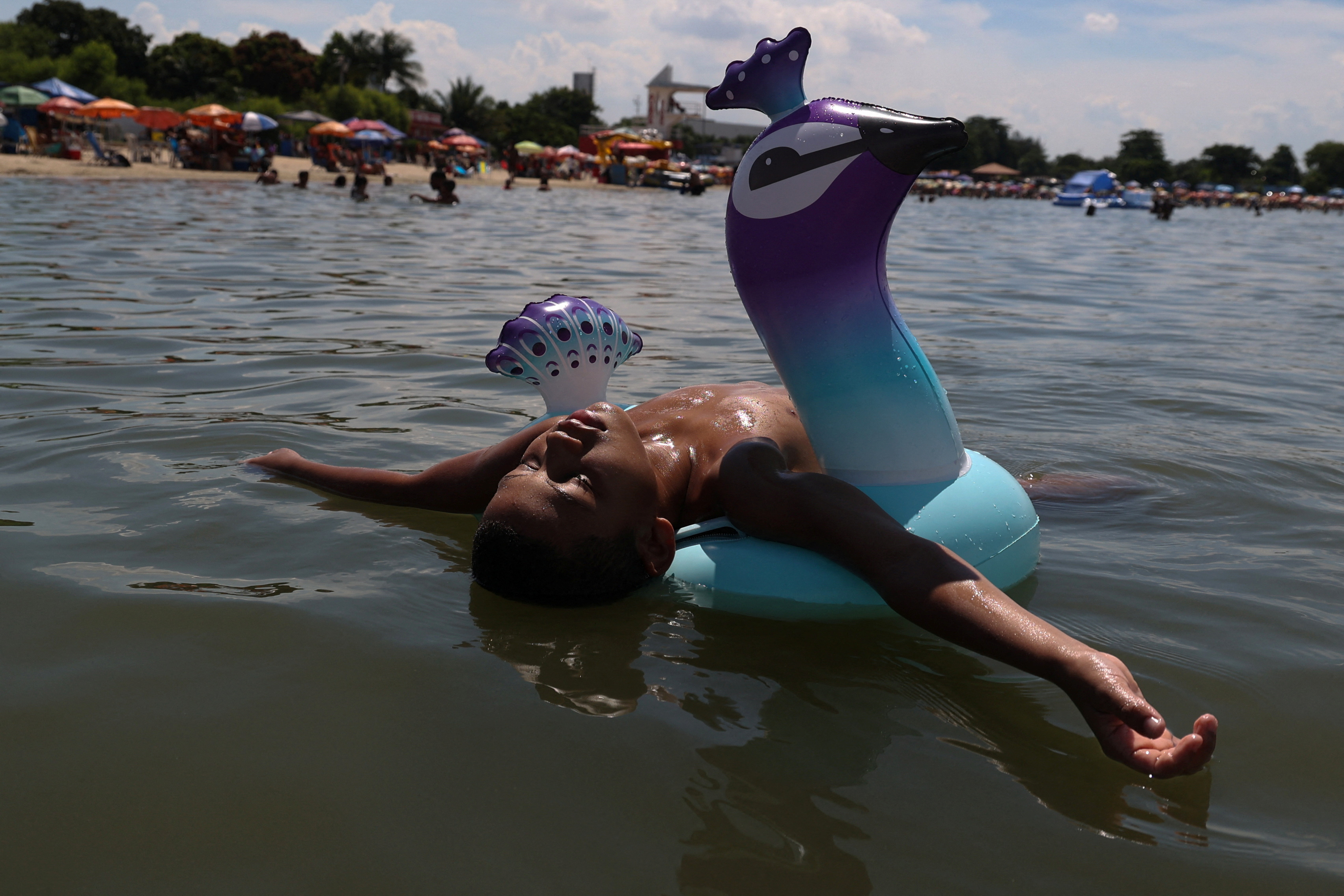 A boy floats at the artificial pond known as Piscinao de Ramos, or big pool, in the northern suburbs of Rio de Janeiro, Brazil on February 9, 2025. (Photo by Aline Massuca/Reuters)