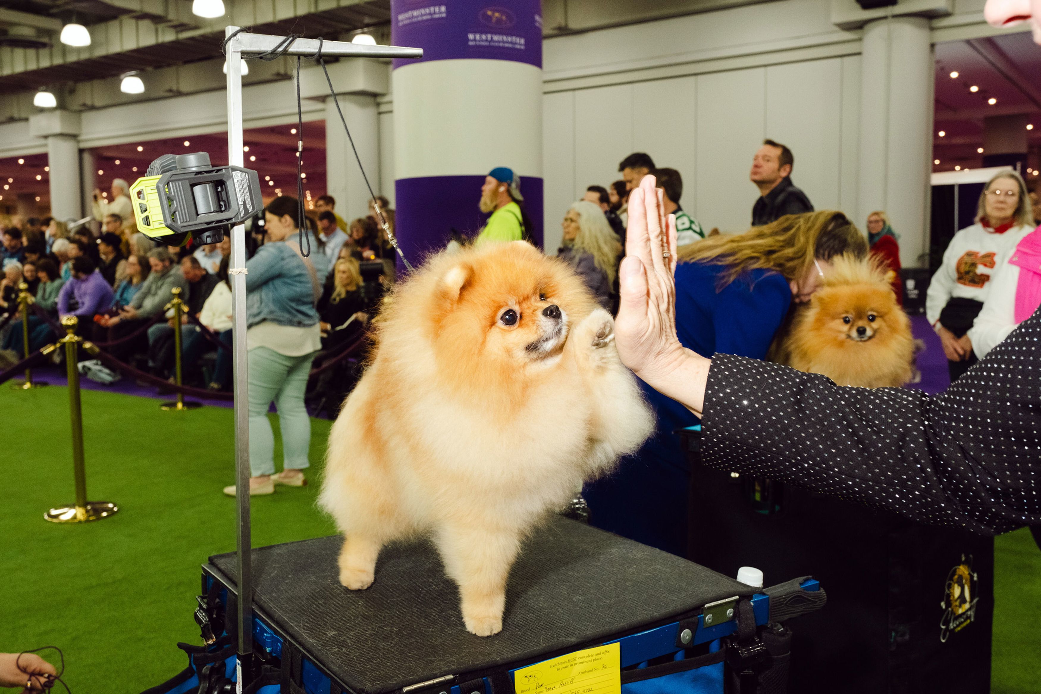 Tonic, a Pomeranian, gives a high-five to owner/handler Sonya Ratliffe backstage at the Westminster Kennel Club Dog Show in New York on Monday, February 10, 2025. (Photo by Lanna Apisukh/The New York Times/Redux)