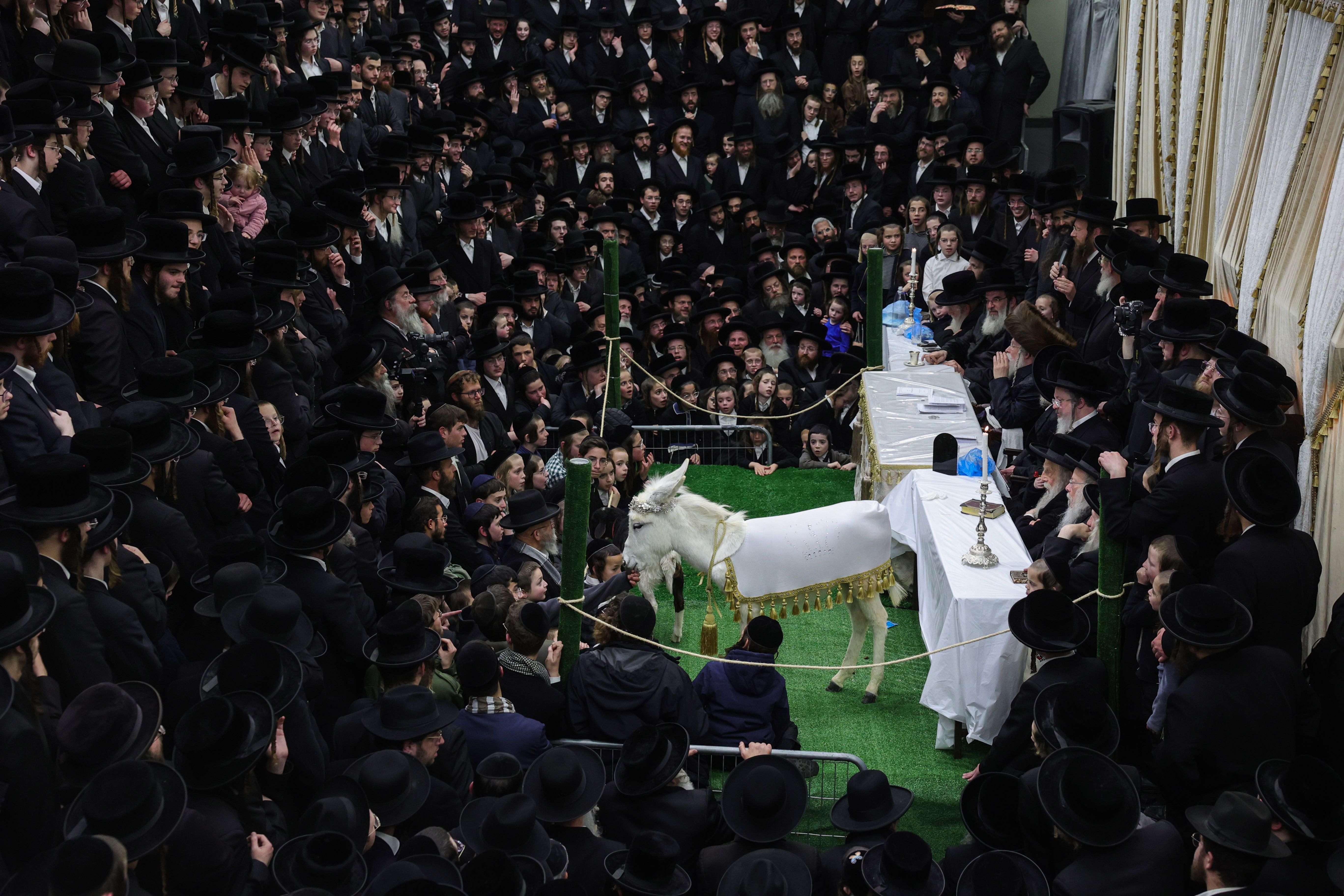 Ultra-Orthodox Jews pray around a decorated small donkey and lamb during a ceremony called the “Redemption of the first born donkey” or in Hebrew “Pidyon Petter Chamor”, in the Mea Shearim neighborhood in Jerusalem, Israel, 13 February 2025. The tradition of the Redemption of the firstborn donkey is part of the 613 laws commemorated in the Jewish Bible. (Photo by Abir Sultan/ EPA)